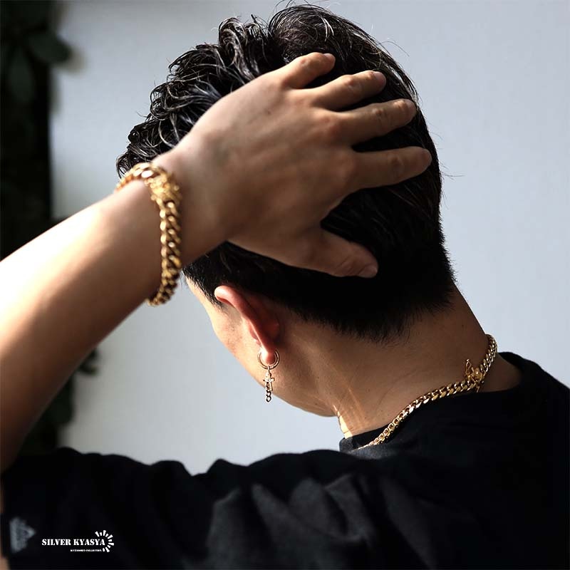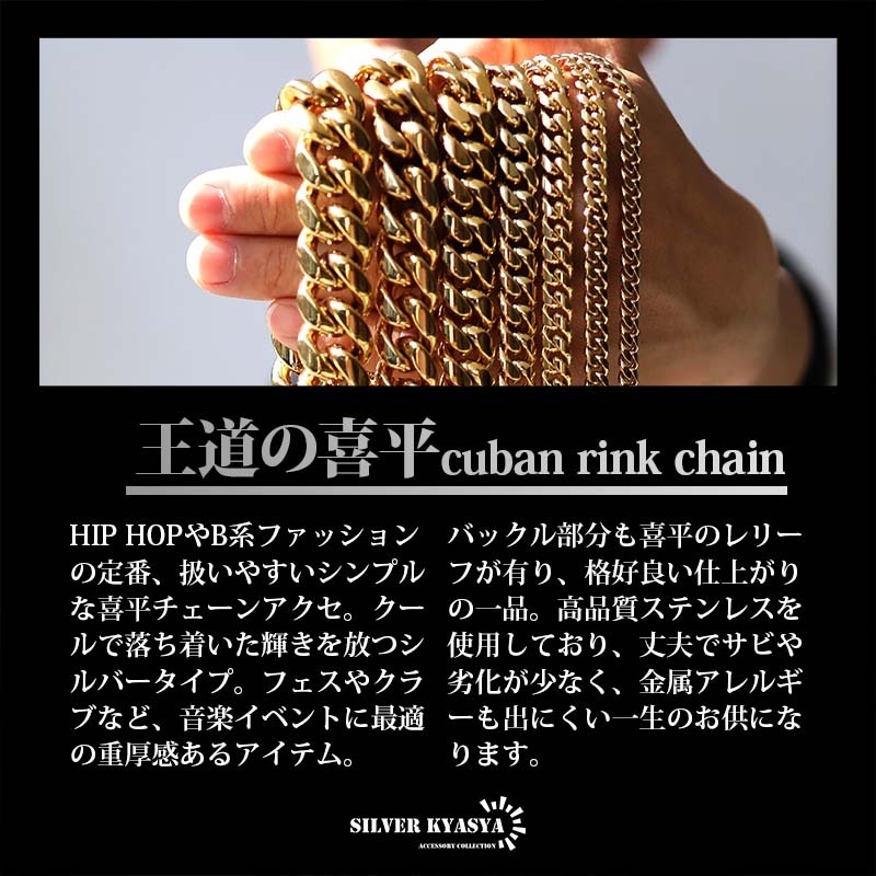 【SILVER KYASYA発大人気のチェーンネックレス】 HIP-HOPアーティストがこよなく愛する定番のマイアミキューバンリンクチェーンのネックレスタイプ。喜平チェーンとも呼ばれるこのネックレスは重厚感が首元のアクセントに最適なアイテムです。 【活躍シーン】 フェスやクラブ・音楽イベント等のシーンや、ダンス衣装に合わせるなど。もちろん普段使いとしてTシャツやお気に入りの服装とあわせても○ 自分へのご褒美としても、友人や恋人へのプレゼントやギフトとしてもおすすめです。 【PIC UP】 本体に使用しているのは高品質ステンレス素材。金属アレルギーフリーアイテムです。耐久性に優れており、水や汗などで錆びることはありません。 留め具はお洒落な見た目の二重ロックタイプ。バックル部分にも喜平のレリーフがあり、胸元のアクセントに最適! | |