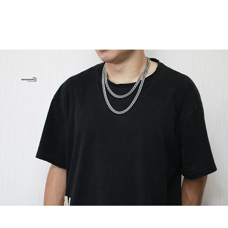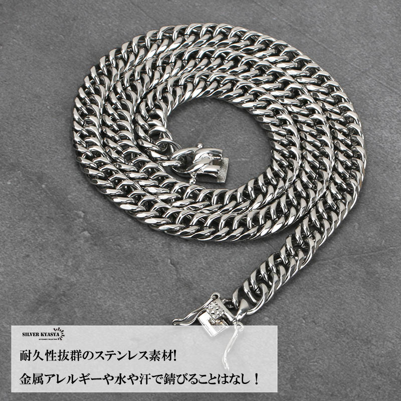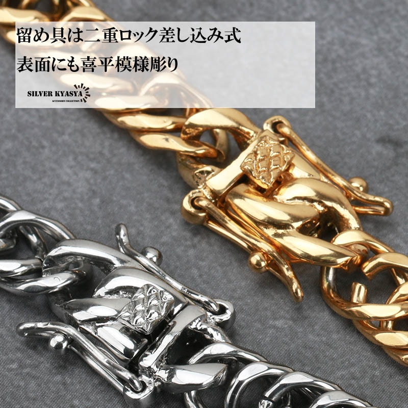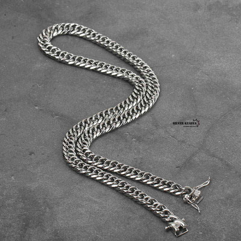 【SILVER KYASYA発大人気のチェーンネックレス】 HIP-HOPアーティストがこよなく愛する定番のマイアミキューバンリンクチェーンのネックレスタイプ。喜平チェーンとも呼ばれるこのネックレスは重厚感が首元のアクセントに最適なアイテムです。 【活躍シーン】 フェスやクラブ・音楽イベント等のシーンや、ダンス衣装に合わせるなど。もちろん普段使いとしてTシャツやお気に入りの服装とあわせても○ 自分へのご褒美としても、友人や恋人へのプレゼントやギフトとしてもおすすめです。 【PIC UP】 本体に使用しているのは高品質ステンレス素材。金属アレルギーフリーアイテムです。耐久性に優れており、水や汗などで錆びることはありません。 留め具はお洒落な見た目の二重ロックタイプ。バックル部分にも喜平のレリーフがあり、胸元のアクセントに最適! | |