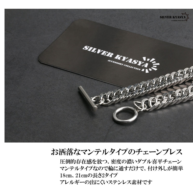 話題の人気商品、マンテルタイプのチェーンブレスレット 圧倒的存在感を放つ、密度の濃いダブル喜平チェーンモデル 19.5cm、22.5cmの2サイズ シンプルでお洒落なデザイン、色んなジャンルのファッションにも取り入れられる 高品質ステンレスで錆や汚れがつきにくく、アレルギーも出にくい 男女兼用アイテムで、 男性・女性などの恋人へのプレゼントはもちろん 友人・ご家族へのギフトにもおすすめです。 | |