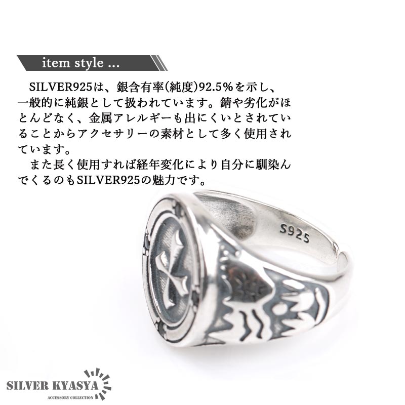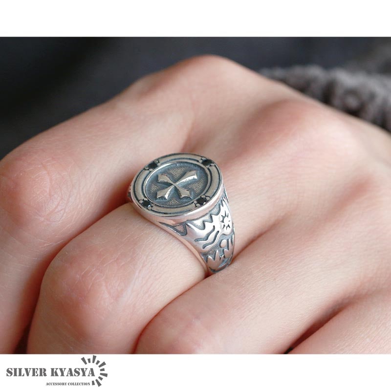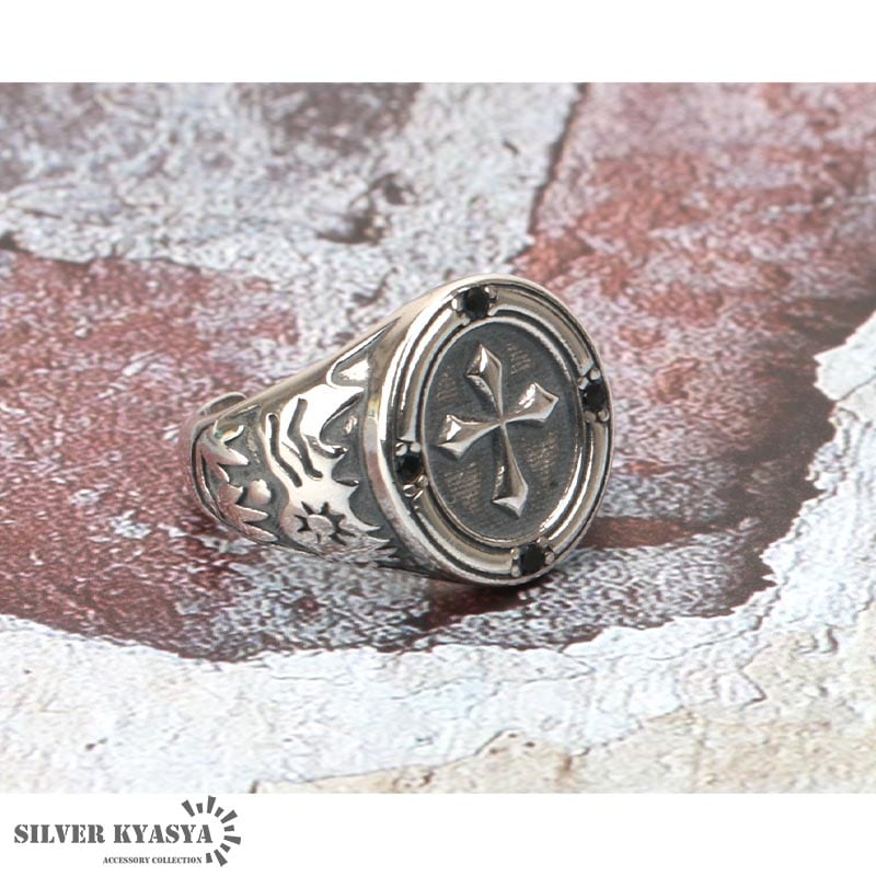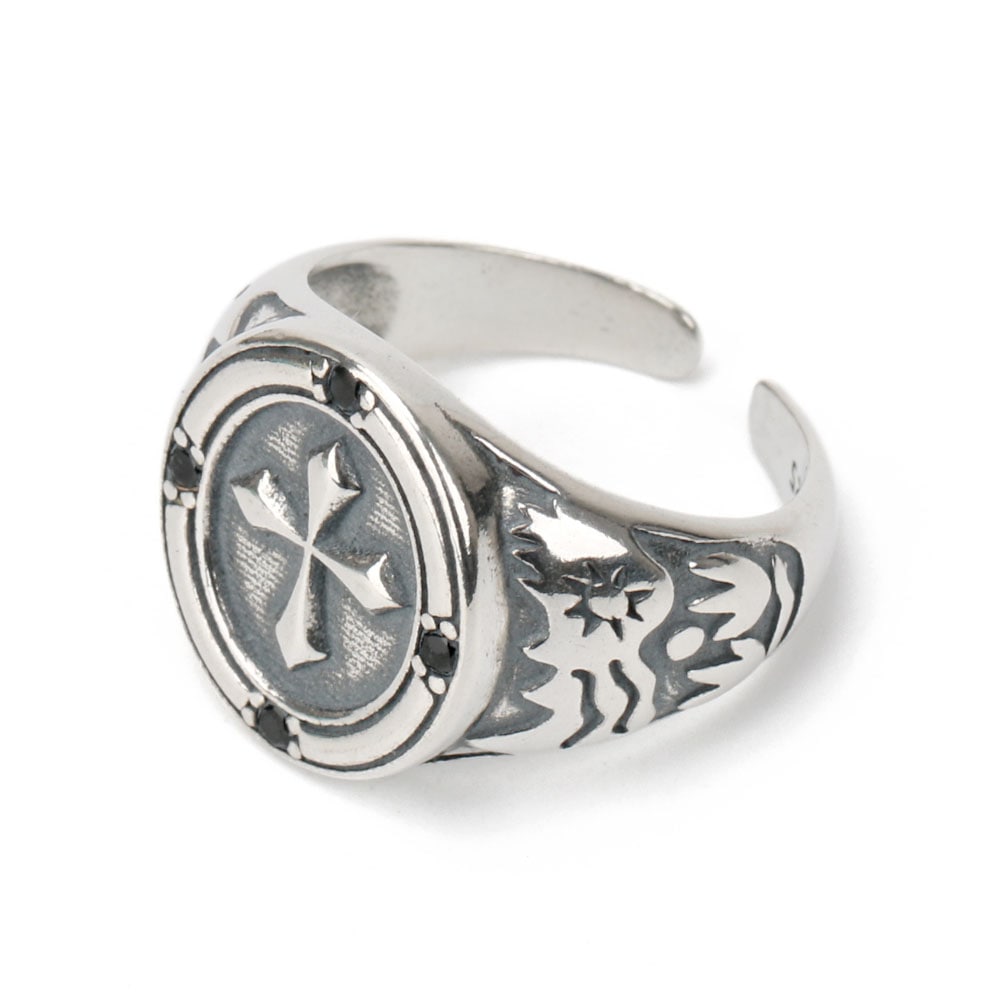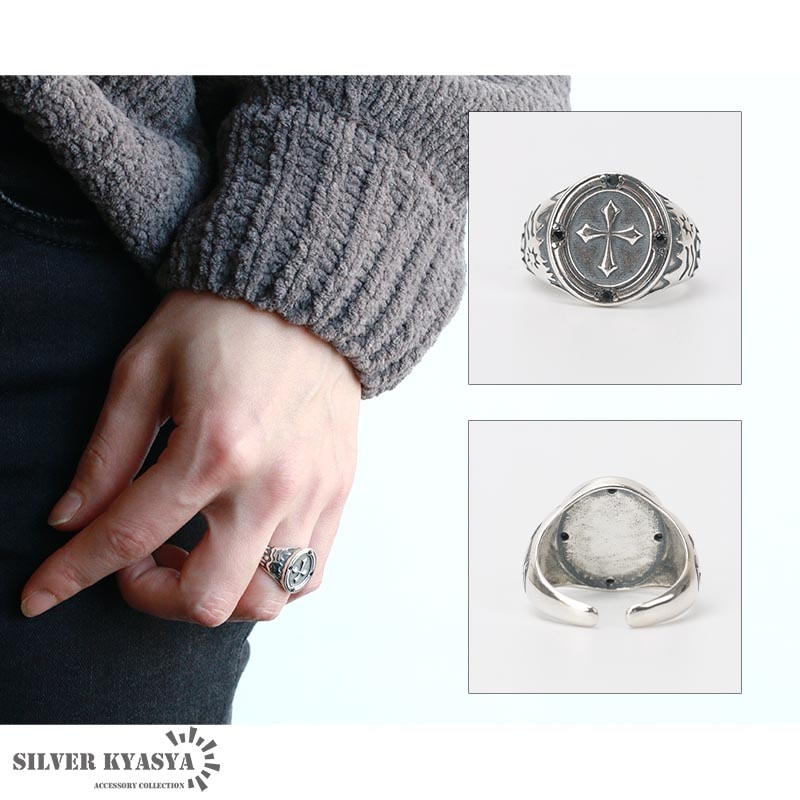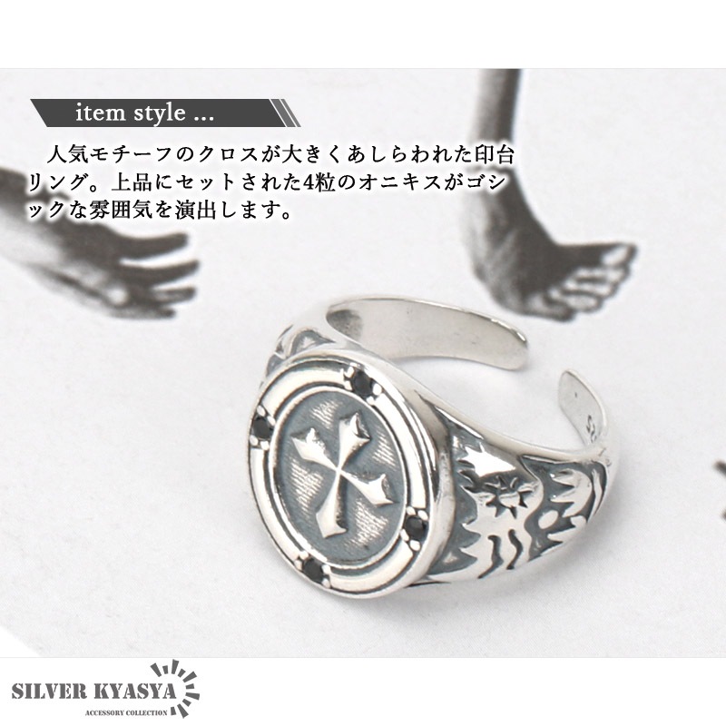 人気モチーフのクロスが大きくあしらわれた印台リング。上品にセットされた4粒のオニキスがゴシックな雰囲気を演出します。 フリーサイズのオープンリングタイプで、サイズを可変できます。その日の気分やファッションによって着ける指を変えられます。 シルバ-925素材を使用しており、丈夫で劣化が少ないため長く使え、金属アレルギーも出にくいとされているためあんしん! | |