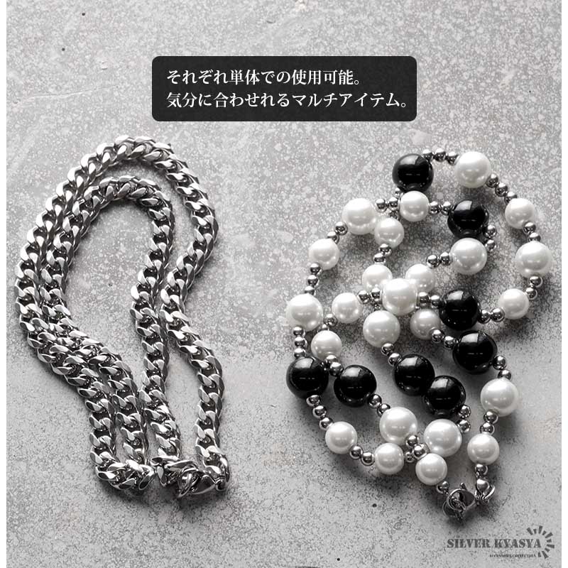 | | 全長 パールネックレス:約55cm) 喜平チェーン:約45cm パールサイズ:(大)約10mm、(小)約8mm、(黒)約11mm 喜平サイズ:幅7mm、厚み3mm |