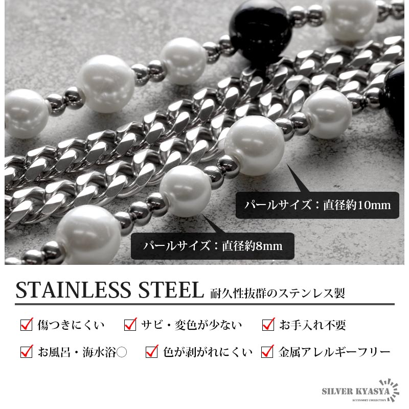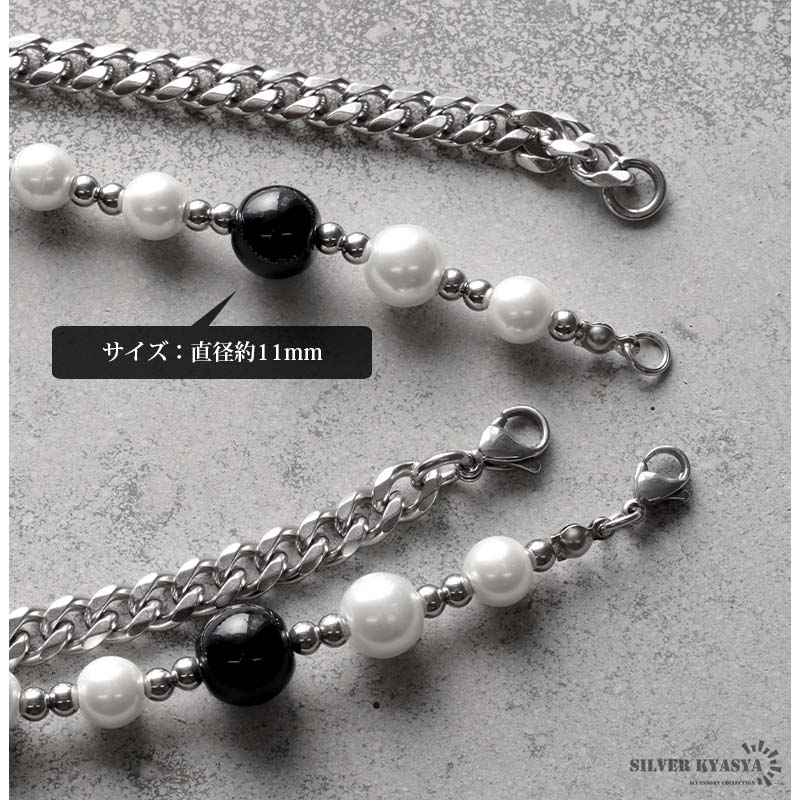 4面カットの喜平チェーンとパール&ブラックパールビーズを交互に並べたシンプルで合わせやすいアイテム。 喜平は幅7mmの丁度よいサイズ感のものを使用。パールとの相性バツグンの仕上がりで、パール初心者におすすめ。 ビーズ、留め具、喜平チェーンはステンレス製。ステンレスはサビや劣化が少なく、傷つきにくいため永く使えます。 シルバー925製のものと違いお手入れなども不要なため、日常使い・普段使いにおすすめです。 金属アレルギーも出にくいとされており安心して使用できます。 | |
