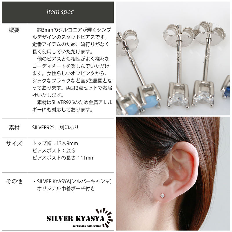 直径約3ミリのジルコニアが輝くシンプルばデザインのスタッドピアスです!小ぶりなサイズ感でさらっと取り入れられるデザイン!他のピアスとも合わせやすい!5カラーバリエーション!両耳用2点セットでお届けします! Aタイプスカイブルー Bタイプホワイト Cタイプクリアブルー Dタイプピンク Eタイプブラック シルバ-925素材を使用しており、丈夫で劣化が少ないため長く使え、金属アレルギーも出にくいとされているためあんしん! | |