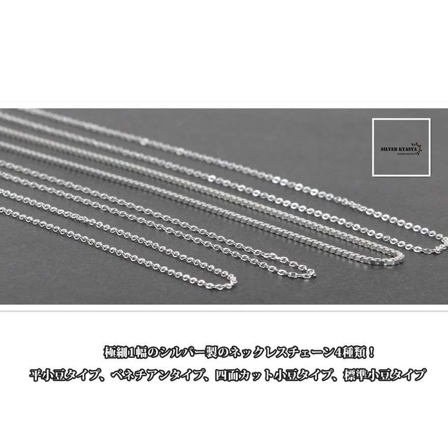 極細スタイルの様々なシーンで使用できる 定番のシルバーチェーン4タイプ! シンプルなネックレスチェーンで使いやすい ペンダントに最適! 素材感のあるシルバー925素材のネックレス アレルギーも出にくく、末永く使える 幅広いサイズ展開でプレゼントやギフト 恋人や夫婦など、大切方との ペアアクセサリーとしてもおすすめです。 | |