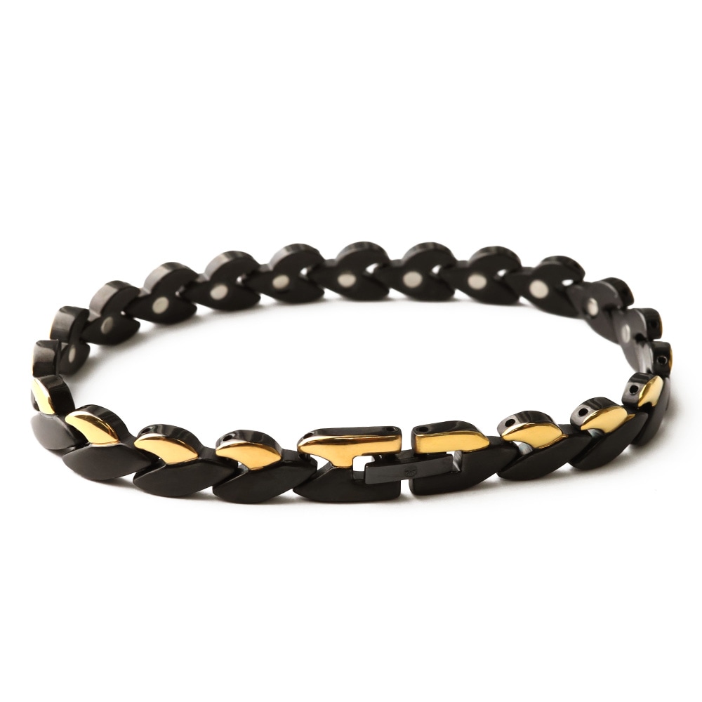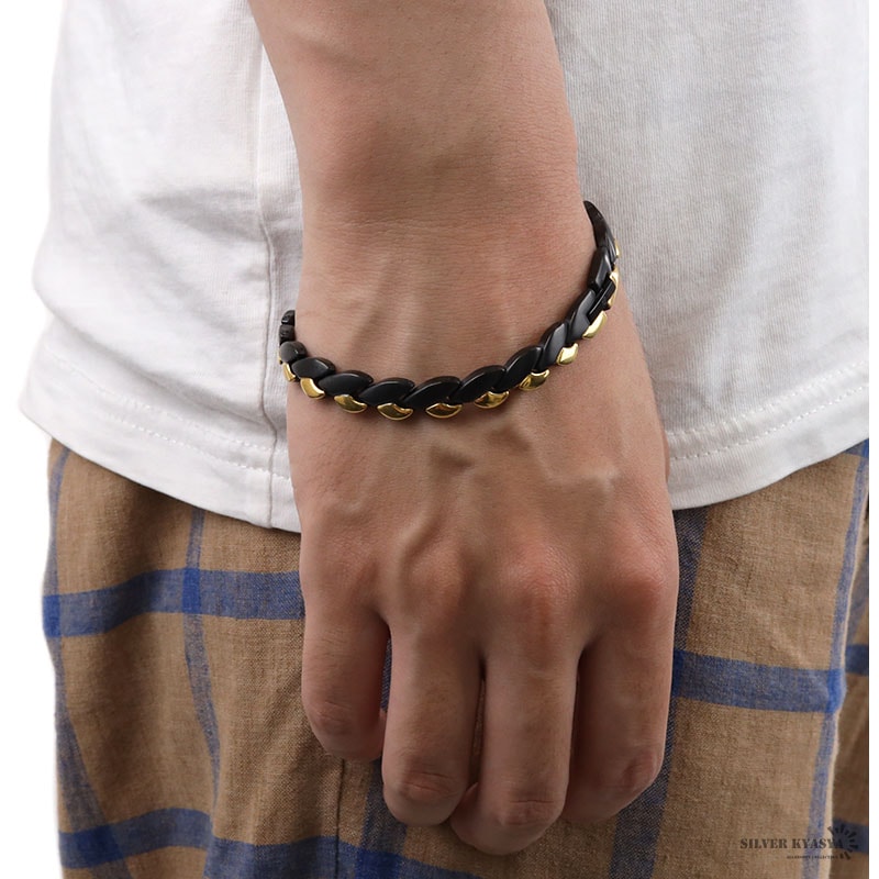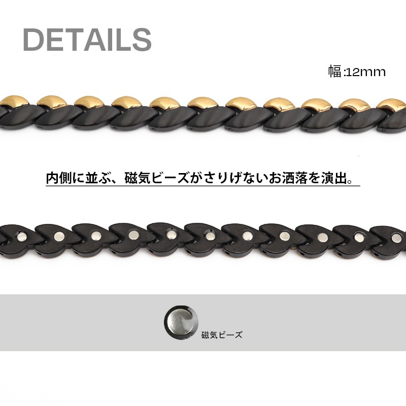 ■ITEM DETAIL チタニウム素材を使用した、磁気ブレスレット。なめらかなゴールドと質感の良いブラックが半面ずつにデザインされたアイテム。磁気ビーズがさりげないお洒落を演出。 ■男心くすぐるチタン素材を使用 耐食性が高く汗や水分に強いレジャーシーンなどで大活躍するチタン素材を使用。丈夫で長持ちする素材なので永く使えるアクセサリーになります。さらにその軽さは付けているのを忘れるほどの快適な装着感を実現。 ■ビーズの種類 シルバー:磁気ビーズ ■自分へのご褒美としても、友人や恋人へのプレゼントとしてもおすすめです。 | |