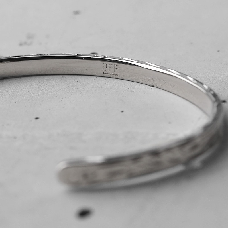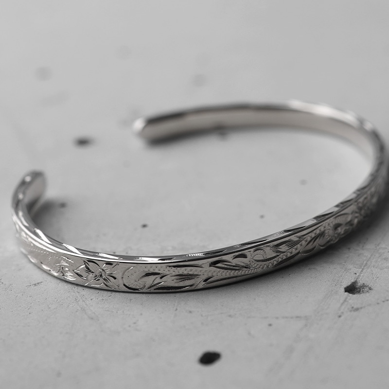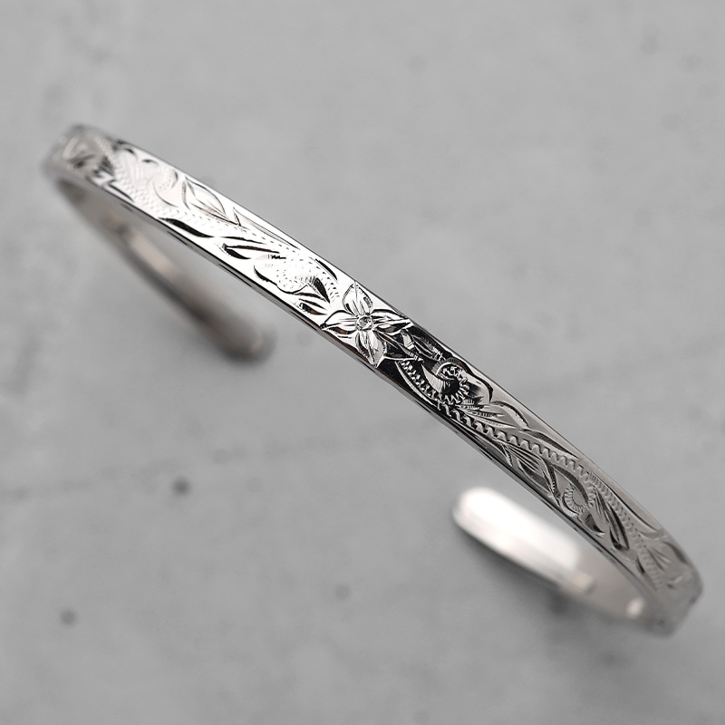 ■ハワイアン×平打バングル 幅4mmタイプ ハワイの身近な花プルメリアを中心に波模様とハワイでは神聖な葉とされているマイレをレリーフしたバングル。レリーフは職人による手掘りで施した。 ■静かな輝きのシルバーカラータイプ クールで取り入れやすいシルバーカラータイプ。ゴールドカラーは別ページよりお買い求めください。 ■BFF -Ocean- コレクションアイテム | |