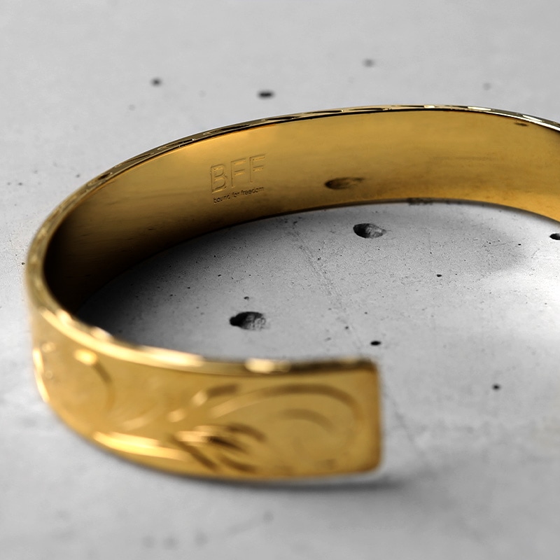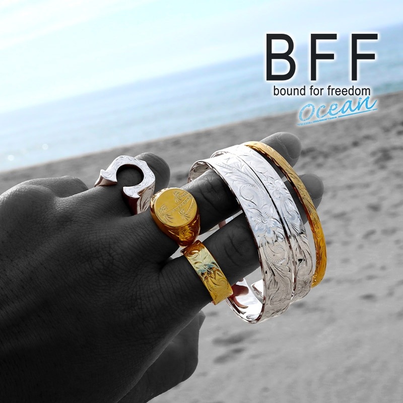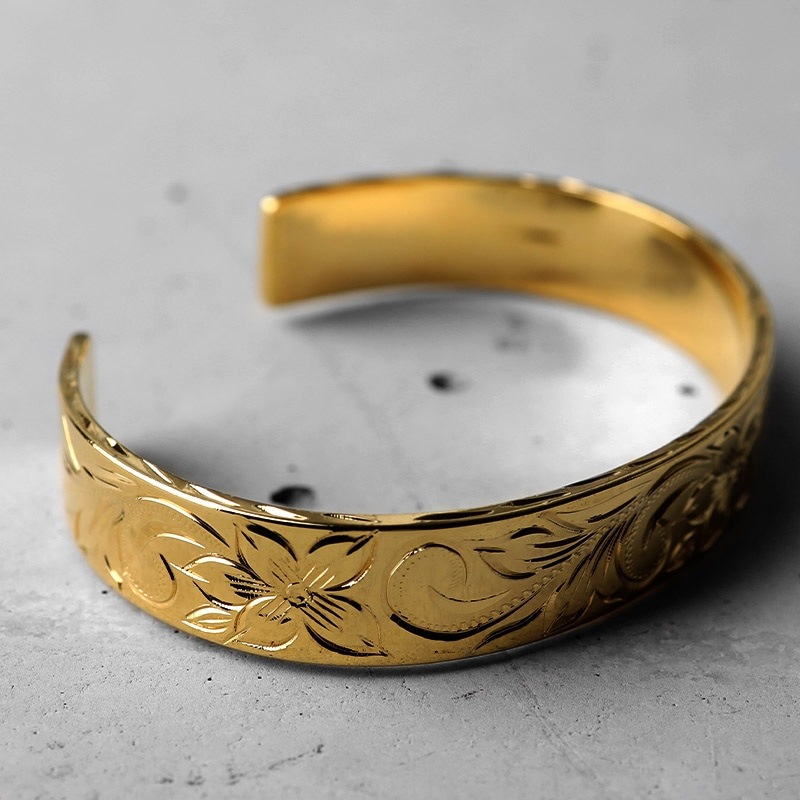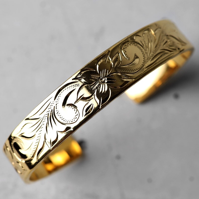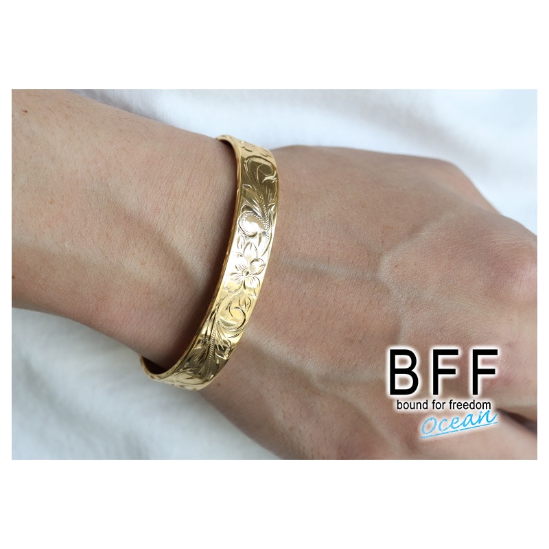 ■ハワイアン×平打バングル 幅12mmタイプ ハワイの身近な花プルメリアを中心に波模様とハワイでは神聖な葉とされているマイレをレリーフしたバングル。レリーフは職人による手掘りで施した。 ■華やかに輝くゴールドカラータイプ 豪華で華やかに輝く18Kゴールドカラータイプ。シルバーカラーは別ページよりお買い求めください。 ■BFF -Ocean- コレクションアイテム | |