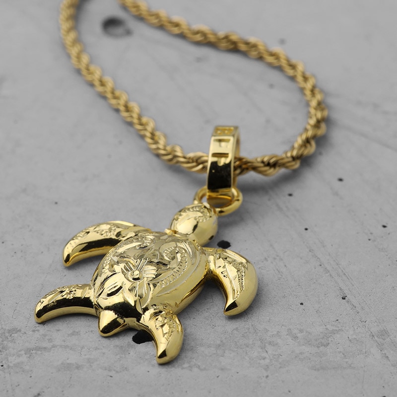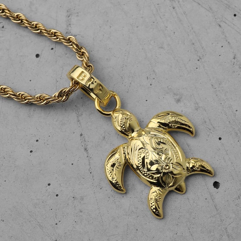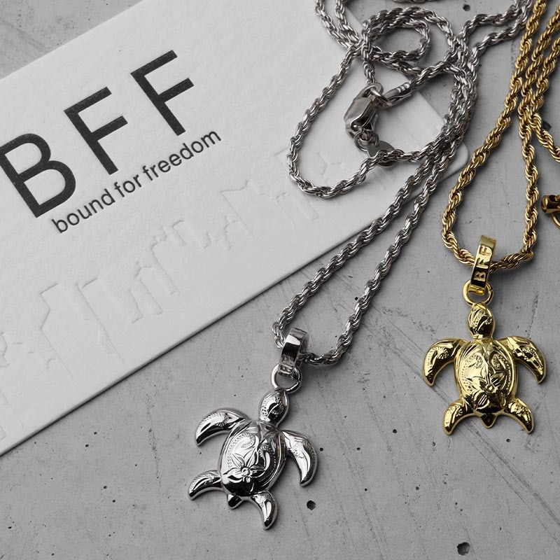 ■ウミガメモチーフネックレス 「海の守り神」として知られるウミガメを愛くるしいデザインで表現したトップを据えたネックレス。表面には職人による手掘りのプルメリアとスクロールの彫金を施した気品を兼ね備えたアイテム。 ■シルバー925×18KGP 人気のシルバー925に豪華で華やかに輝く18KGPを施したゴールドカラータイプ(チェーンはステンレス18KGP仕様)。シルバーカラーは別ページでお買い求めください。 ■個性あふれる手彫りアイテム ひとつひとつ職人が丁寧に手彫りした繊細な仕上がり。自分だけの個性を楽しめるアイテムです。 ■BFF -Ocean- コレクションアイテム | |