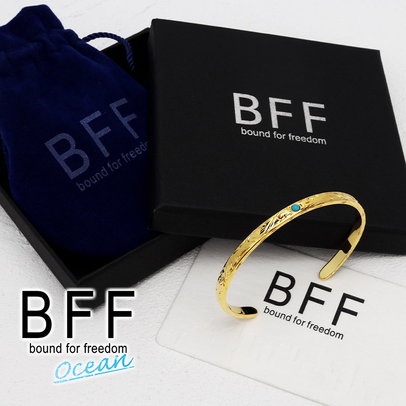■ハワイアン×平打バングル 幅4mmタイプ ハワイの身近な花プルメリアを中心に波模様とハワイでは神聖な葉とされているマイレをレリーフしたバングルに一粒のターコイズをセットしたユニークなバングル。幅4mmの細身タイプ。 ■18KGPコーティング 華やかに輝く18KGPを施したゴールドカラータイプ。シルバーカラーは別ページでお買い求めください。 ■個性あふれる手彫りアイテム ひとつひとつ職人が丁寧に手彫りした繊細な仕上がり。自分だけの個性を楽しめるアイテムです。 ■BFF -Ocean- コレクションアイテム | |