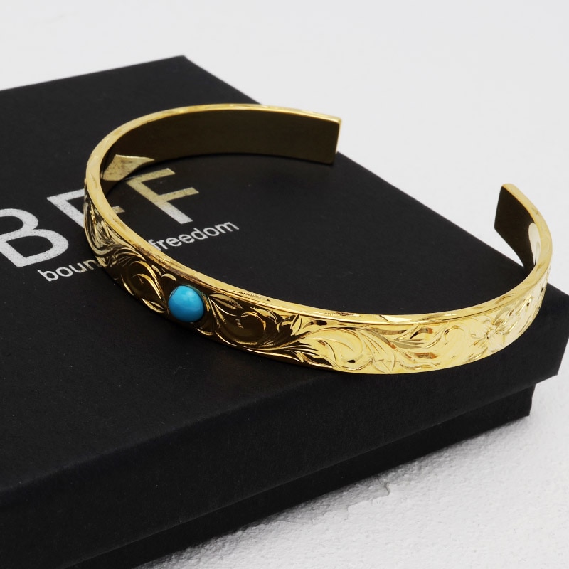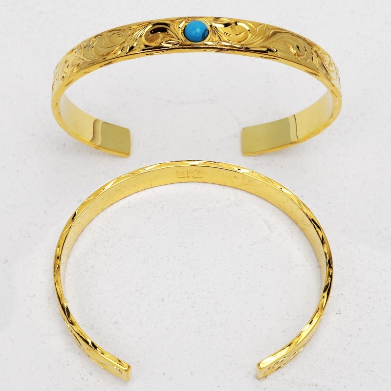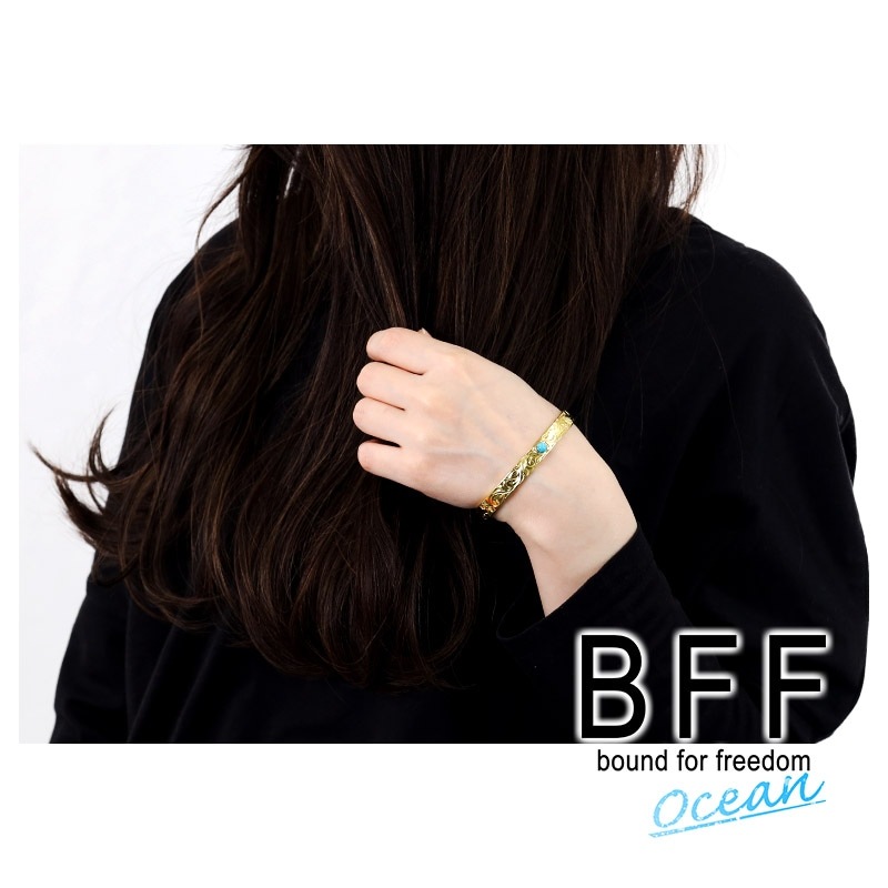 ■ハワイアン×平打バングル 幅8mmタイプ ハワイの身近な花プルメリアを中心に波模様とハワイでは神聖な葉とされているマイレをレリーフしたバングルに一粒のターコイズをセットしたユニークなバングル。幅8mmのミドルサイズ。 ■18KGPコーティング 華やかに輝く18KGPを施したゴールドカラータイプ。シルバーカラーは別ページでお買い求めください。 ■個性あふれる手彫りアイテム ひとつひとつ職人が丁寧に手彫りした繊細な仕上がり。自分だけの個性を楽しめるアイテムです。 ■BFF -Ocean- コレクションアイテム | |