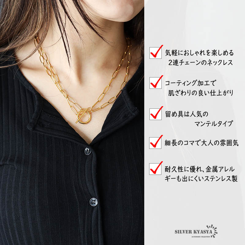 ■ユニークな2重チェーンネックレス 柔らかな丸みを帯びたコマのチェーンを2重に連ねた存在感あるチェーンネックレス。重ね付けのような2連を楽しめる一品。留め具は人気のマンテルタイプで着脱もかんたん。シンプルで親しみやすいデザインで、大人な雰囲気をアピールできます。 ■ステンレス素材を使用 チェーンは頑丈なことで知られるステンレス素材を採用。耐久性はもちろん耐水性も高く水場での着用も可能。つけっぱなしも問題ありません。 ■18KGP 華やかな輝きを誇る18KGPコーティングアイテム。魅力あふれるゴールドカラーが映えるアクセサリーです。 ■SILVER KYASYAオリジナルハンドメイドアイテム | |