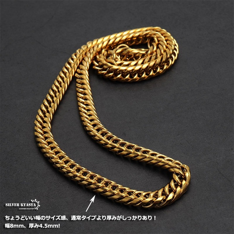 ■カット面がなく、滑らかに仕上げたダブル喜平チェーンネックレス! ■ 定番人気のダブル喜平ネックレスで普段使いにはピッタリのネックレス! ■耐久性抜群のステンレス素材で錆や金属アレルギーの心配もなし! ・つけっぱなしOK。 ・金属アレルギーOK。 ・プール、海水浴、お風呂OK。 ・手入れ不要でOK。 ・定番ネックレスなので、プレゼントにもおすすめ ■表面には18Kメッキ加工、高級感のあるネックレス! ■人気の中折式ロックで見た目もカッコ良く、胸元に存在感を演出してくれるオススメできるネックレス! | |