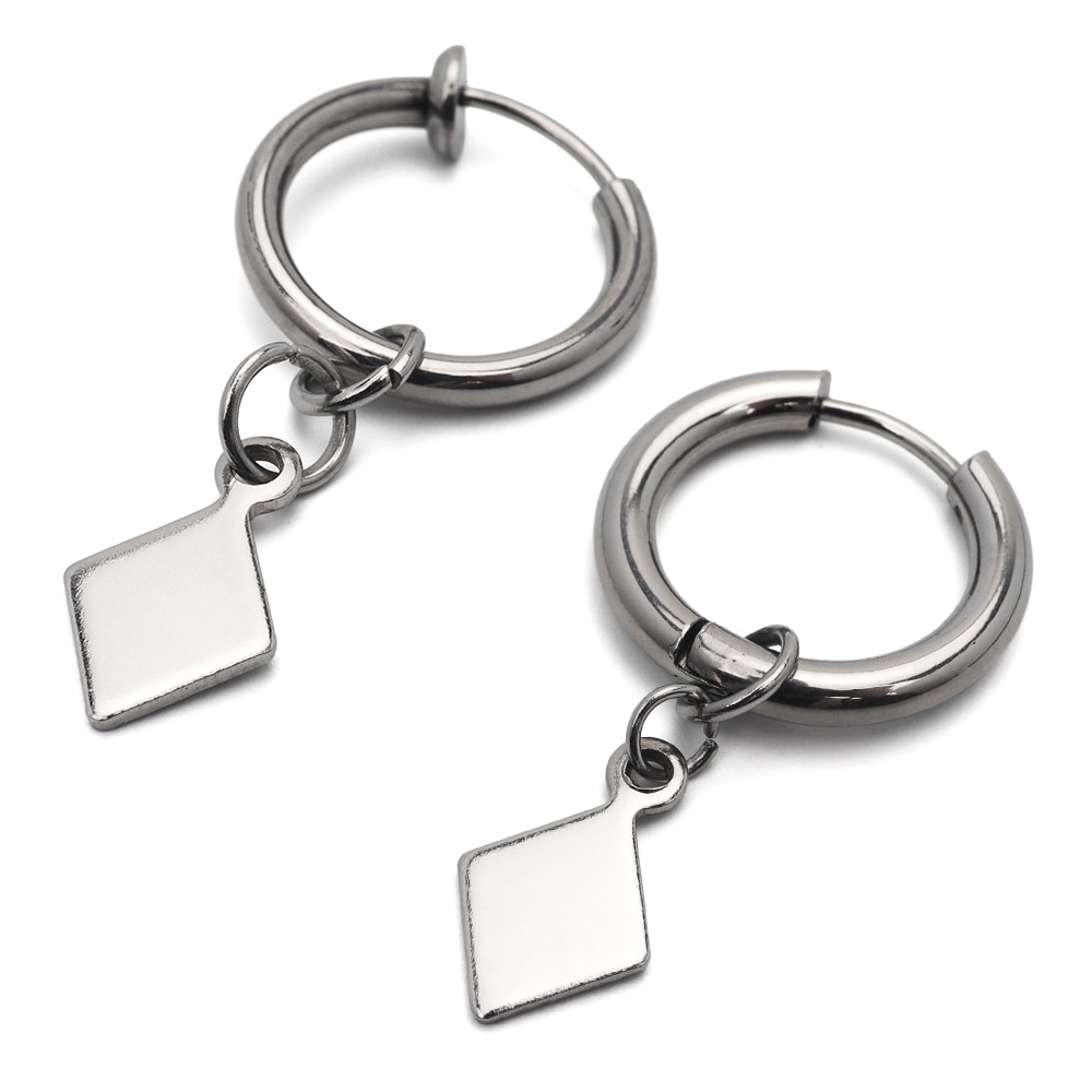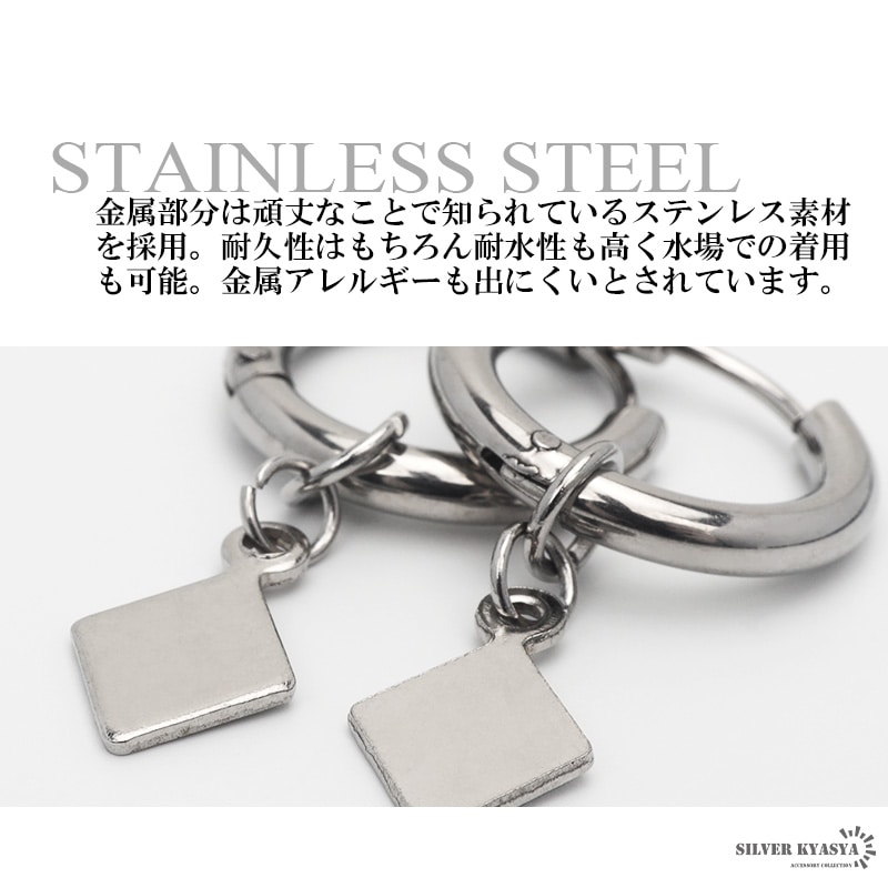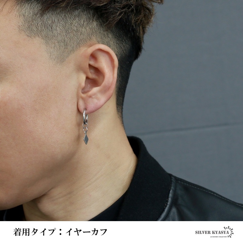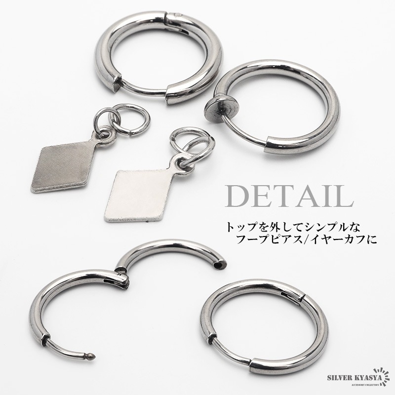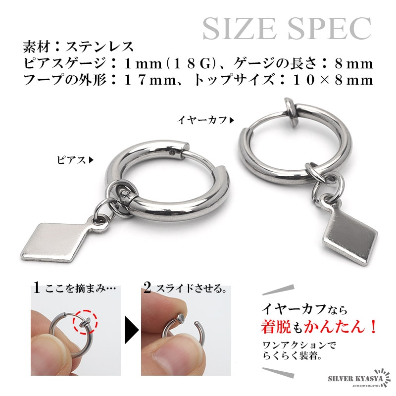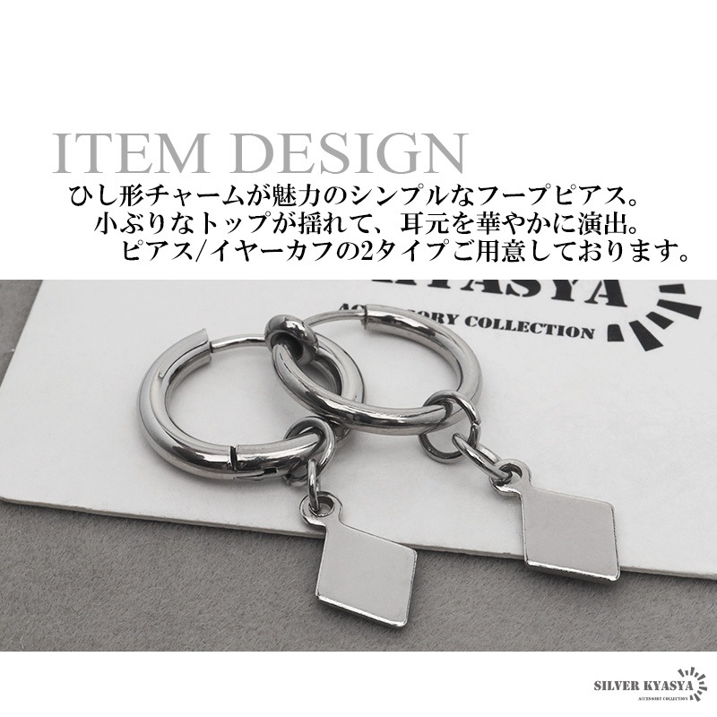 ■ITEM DESIGN ひし形チャームが魅力のシンプルなフープピアス。小ぶりなトップが揺れて、耳元を華やかに演出。 ■ステンレス素材を使用 金属部分は頑丈なことで知られるステンレス素材を採用。耐久性はもちろん耐水性も高く水場での着用も可能。金属アレルギーも出にくいとされている金属です。 ■2タイプ展開 ピアスホール(耳の穴)が必要なフープピアスと、ホールがなくてもつけられるイヤーカフの2タイプからお選びいただけます。 | |