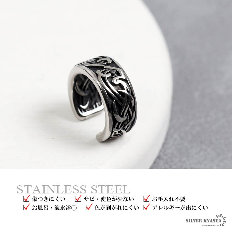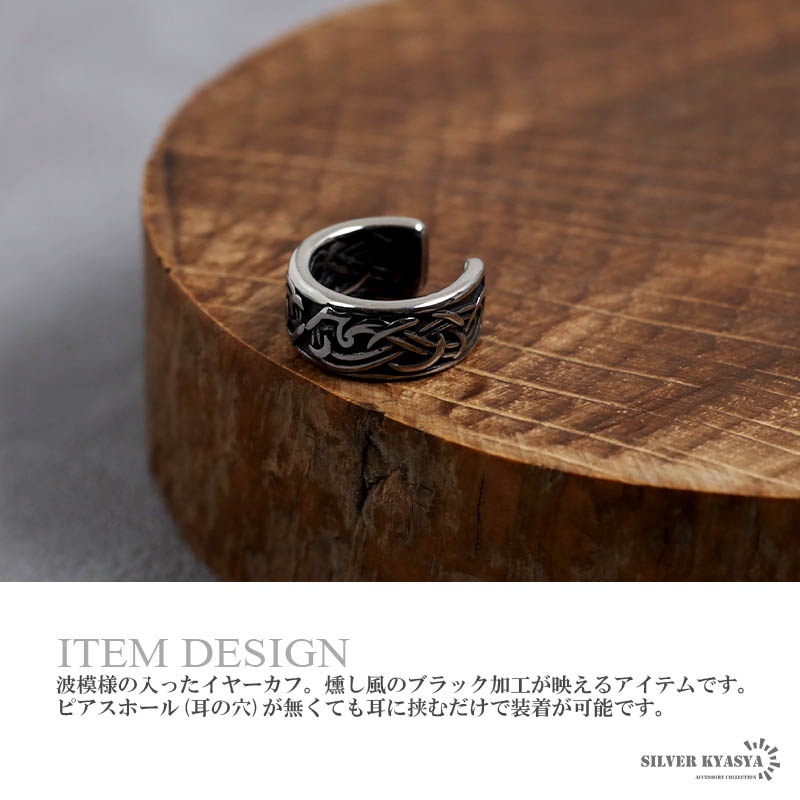 ■ITEM DETAIL スクロールデザインのイヤーカフ。燻し風のブラック加工が映えるアイテムです。ピアスホール(耳の穴)が無くても耳に挟むだけで装着が可能です。 ■ステンレス製 金属部分はステンレス製を採用。耐久性に優れ、水場での使用やつけっぱなしも問題ありません。金属アレルギーも出にくく安心して使用できます。 | |