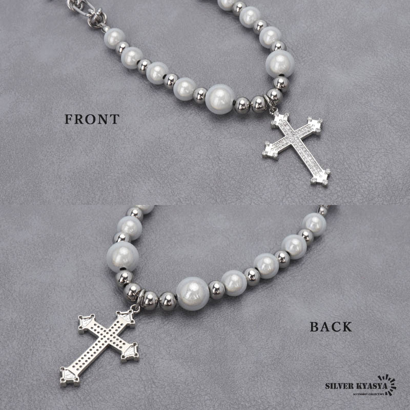 ■パール×クロスネックレス ジルコニアをパヴェしたクロスと大小のパールを繋いだボリューム感たっぷりのストリート風ネックレス。光を反射して虹色に輝くパールが魅力。 ■ステンレス素材を使用 金属部分は頑丈なことで知られるステンレス素材を採用。耐久性はもちろん耐水性も高く水場での着用も可能。金属アレルギーも出にくいとされている金属です。 | |