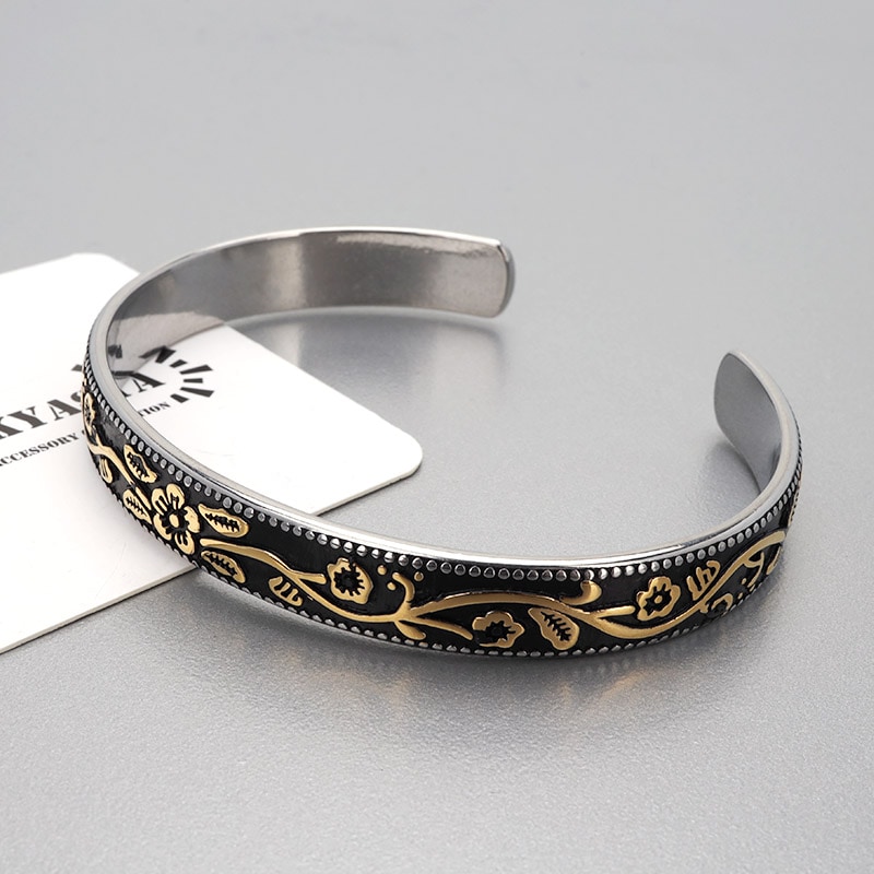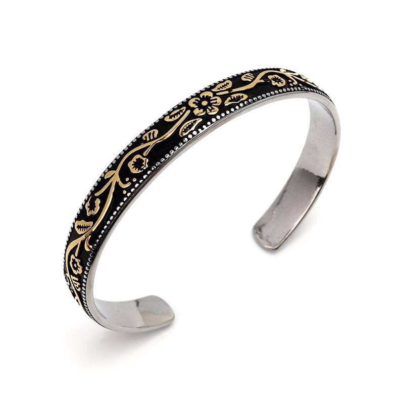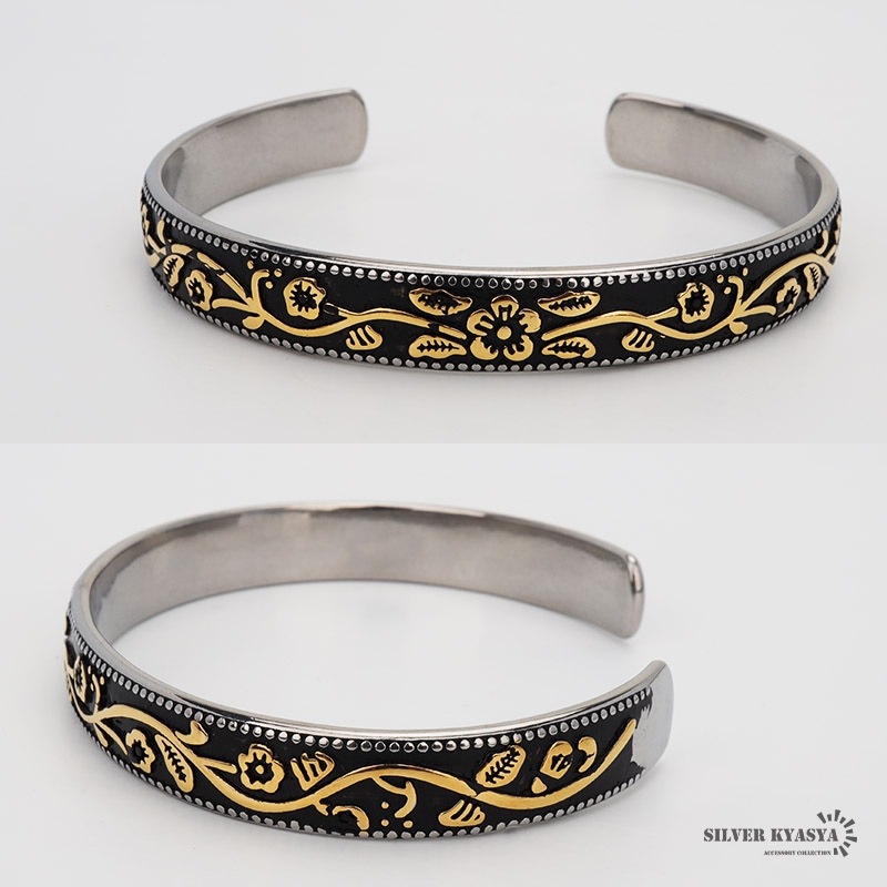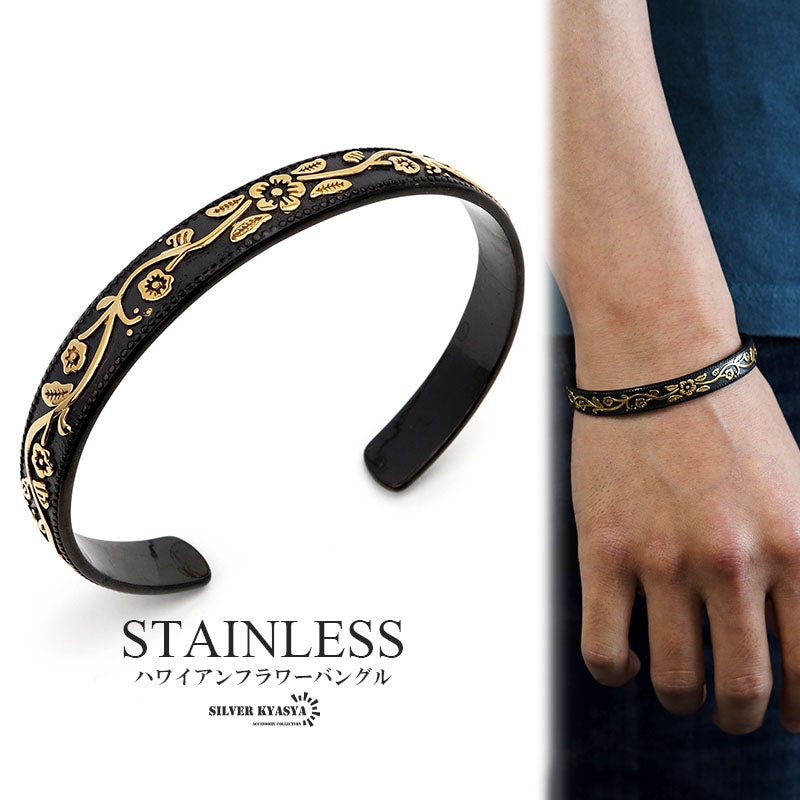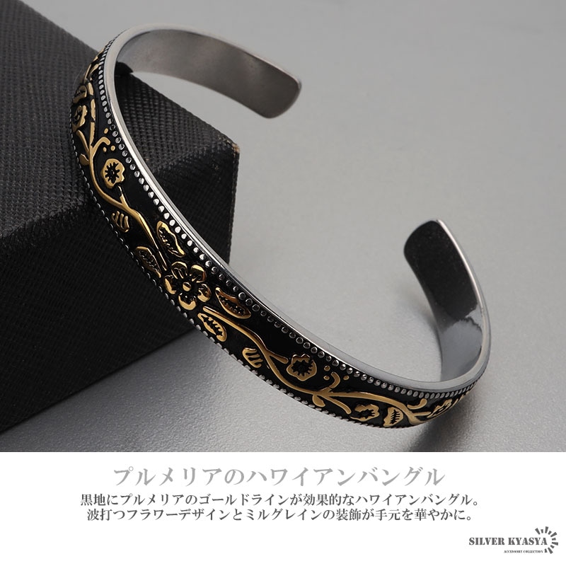 ■プルメリアのハワイアンバングル 黒地にプルメリアのゴールドラインが効果的なハワイアンバングル。波打つフラワーデザインとミルグレインの装飾が手元を華やかに。 ■ステンレス素材を使用 金属部分は頑丈なことで知られるステンレス素材を採用。耐久性はもちろん耐水性も高く水場での着用も可能。金属アレルギーも出にくいとされている金属です。 | |