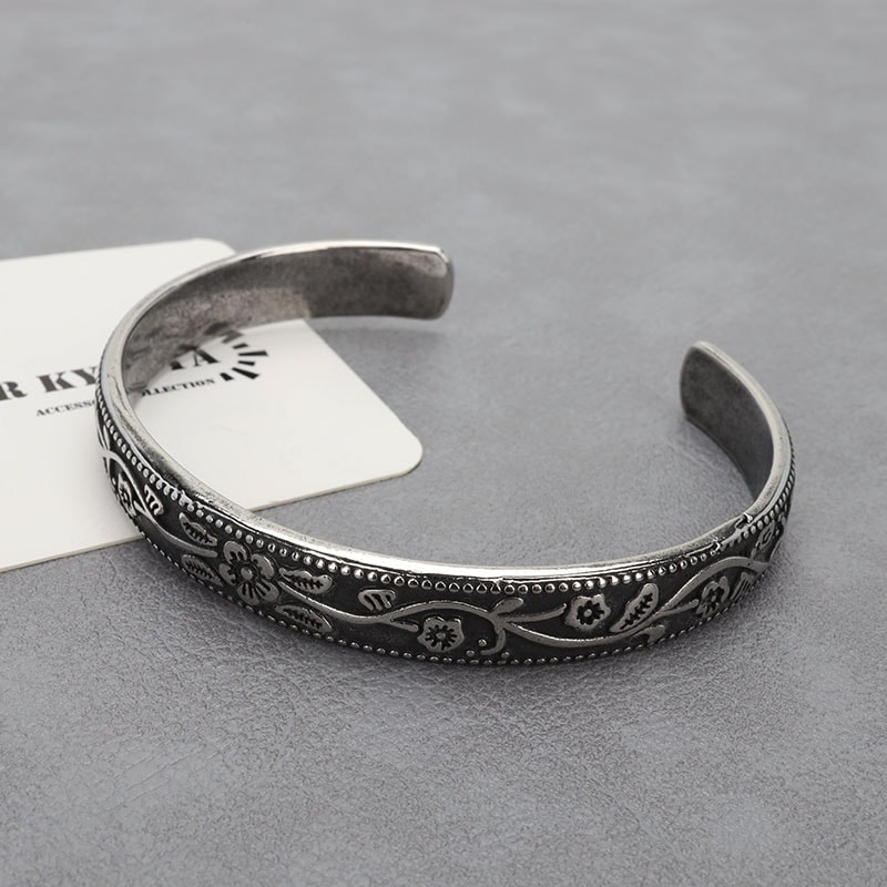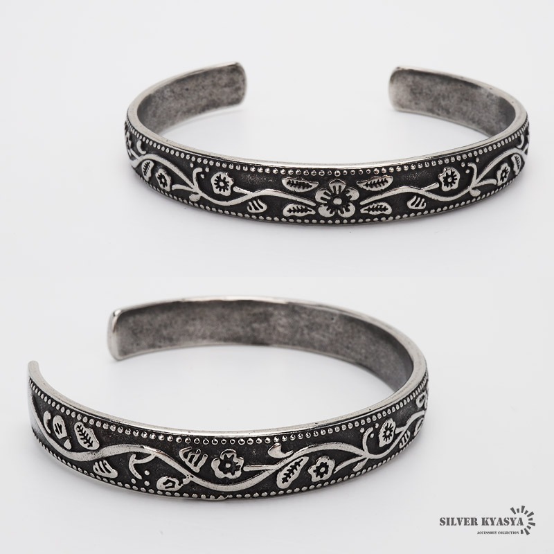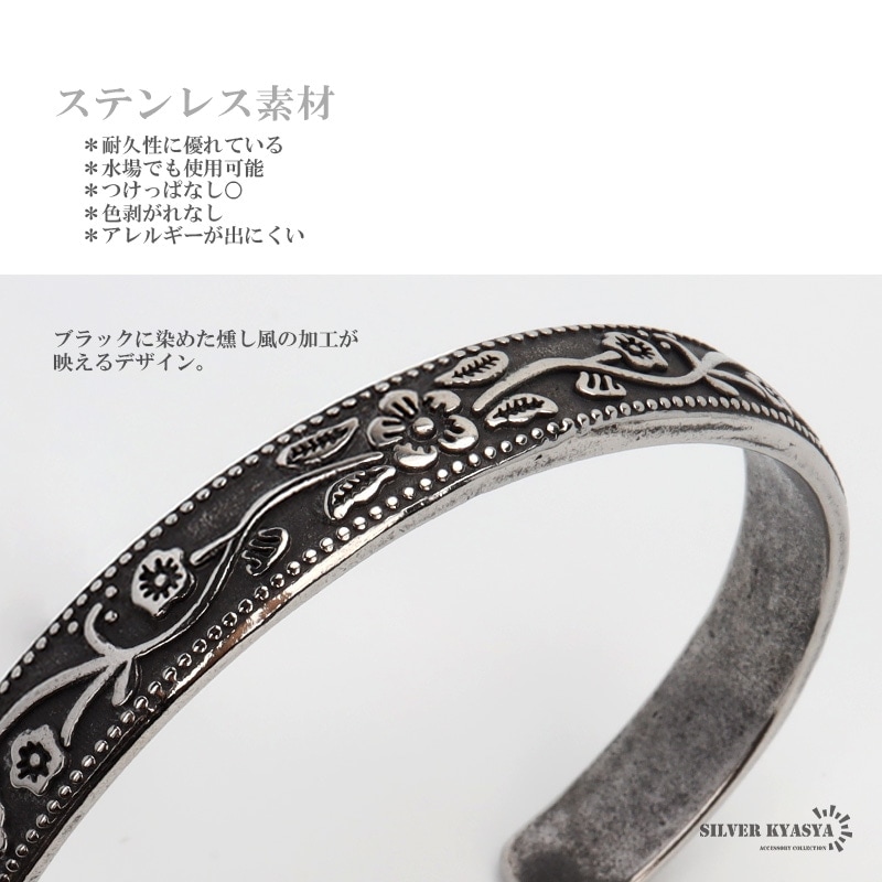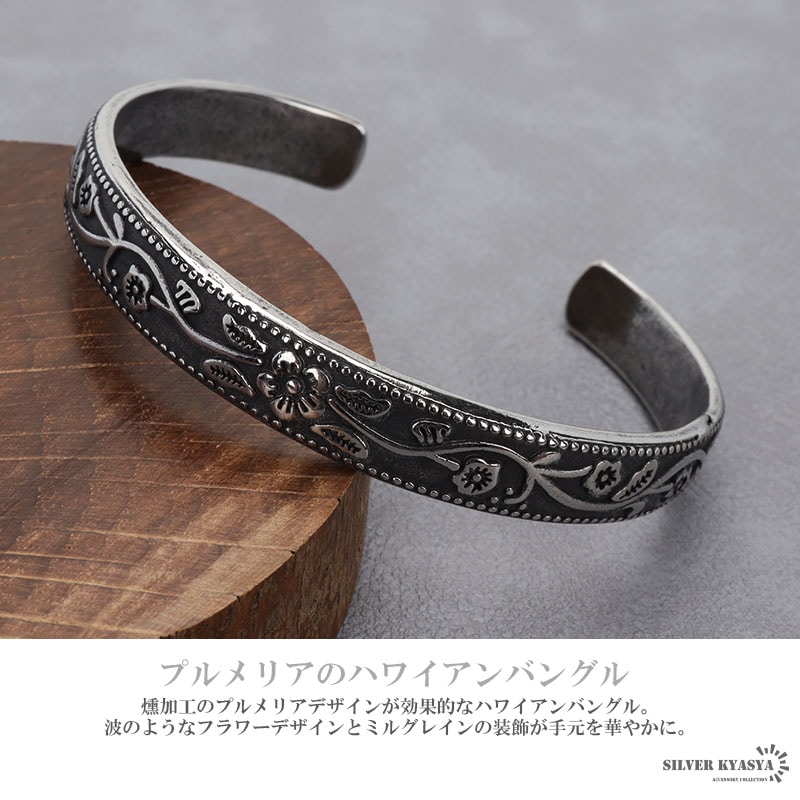 ■プルメリアのハワイアンバングル 燻加工のプルメリアデザインが効果的なハワイアンバングル。波のようなフラワーデザインとミルグレインの装飾が手元を華やかに。 ■ステンレス素材を使用 金属部分は頑丈なことで知られるステンレス素材を採用。耐久性はもちろん耐水性も高く水場での着用も可能。金属アレルギーも出にくいとされている金属です。 | |