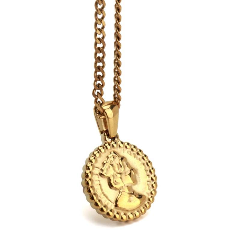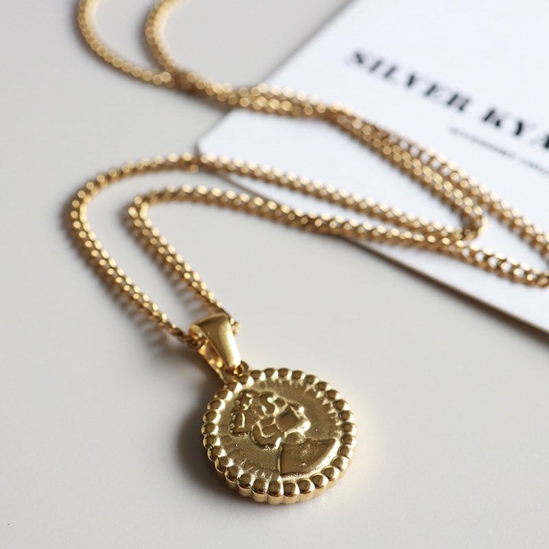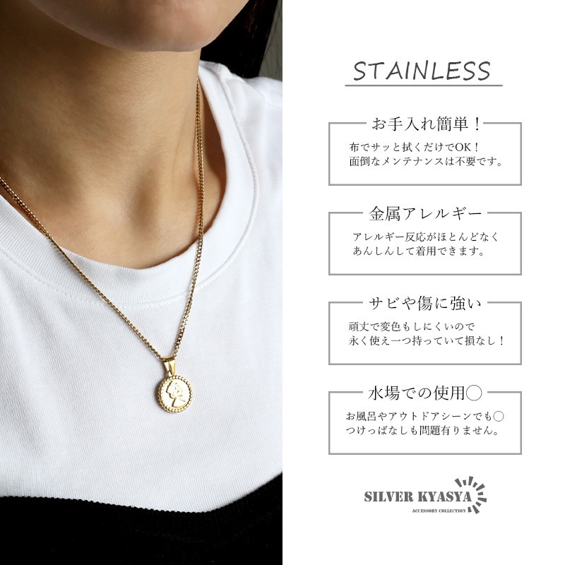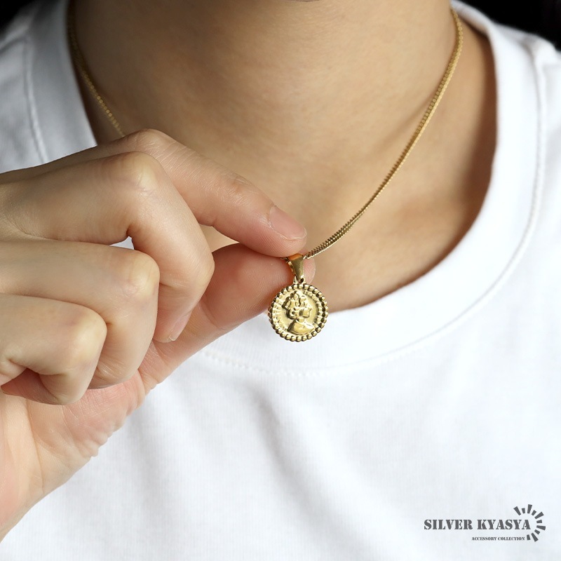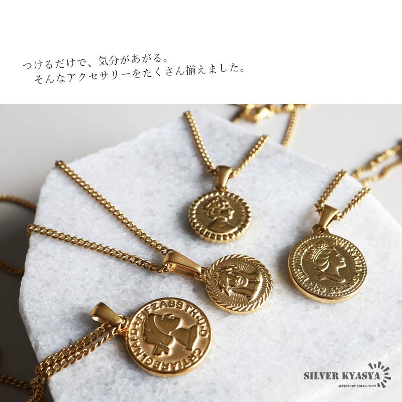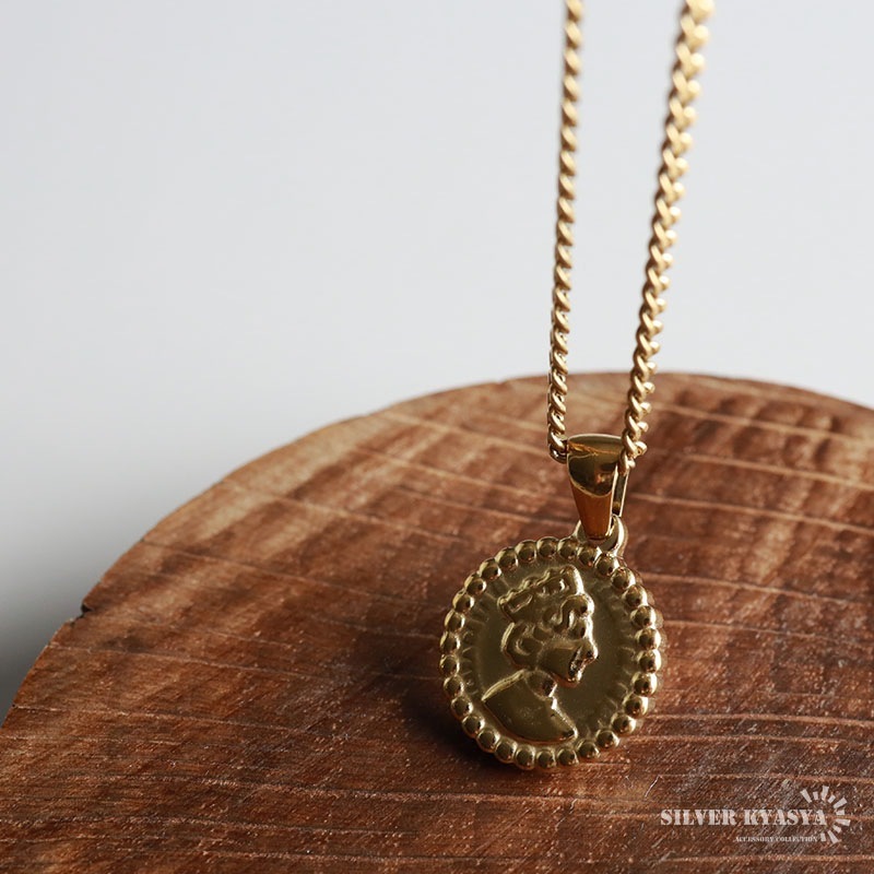 ■ITEM DETAIL エリザベス女王が描かれた硬貨をモチーフにしたネックレス。チェーンは密度の高い喜平タイプで、首元で存在感を発揮します。 ■ステンレス素材を使用 金属部分は頑丈なことで知られるステンレス素材を採用。耐久性はもちろん耐水性も高く水場での着用も可能。金属アレルギーも出にくいとされている金属です。 | |