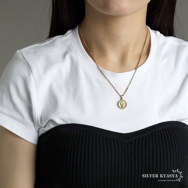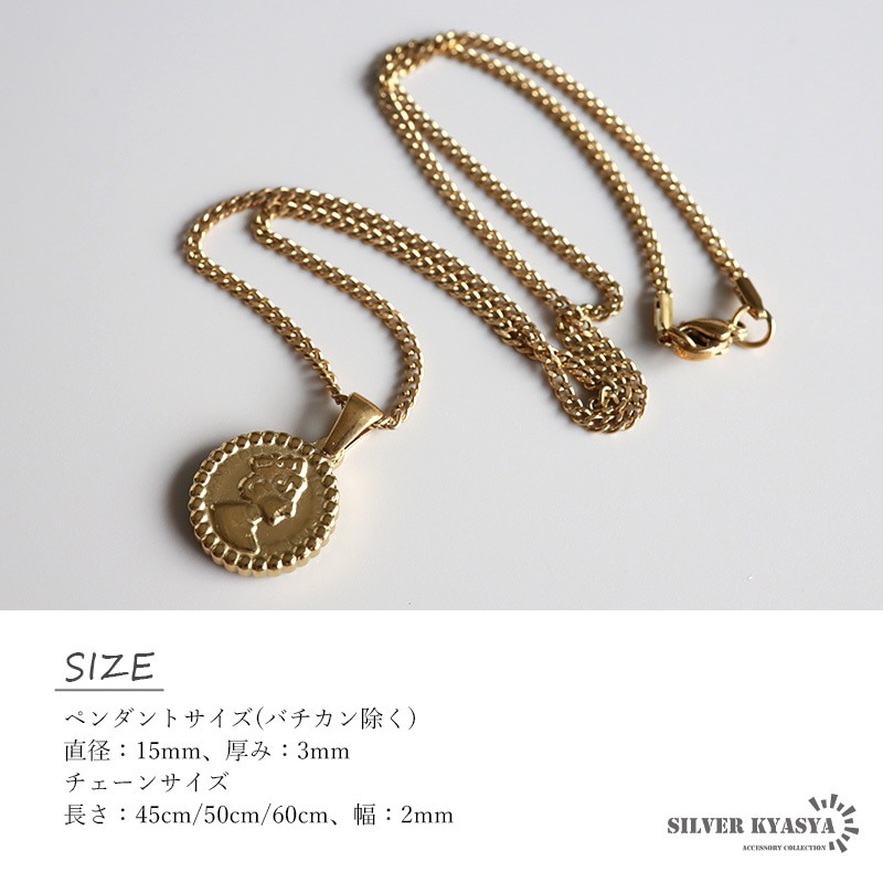 | | ■ペンダントサイズ(バチカン除く) 直径:15mm 厚み:3mm ■チェーンサイズ 長さ:約45cm/50cm/60cm(モデル着用サイズは45cm) 幅:2mm |