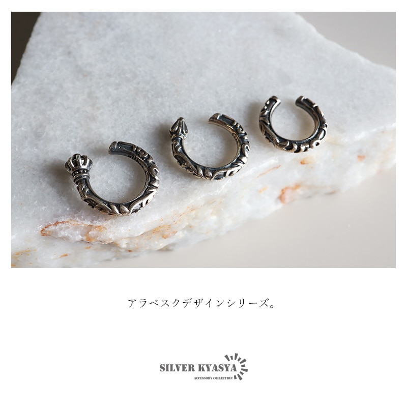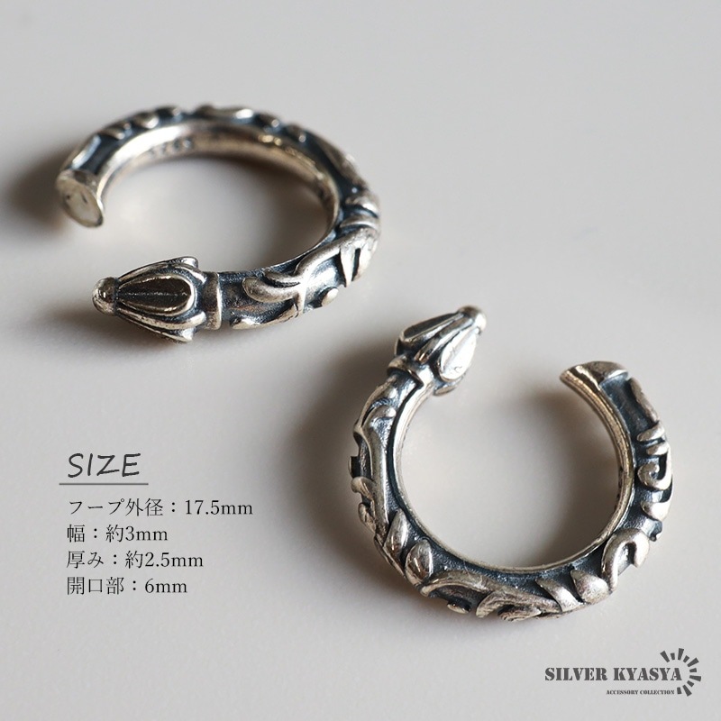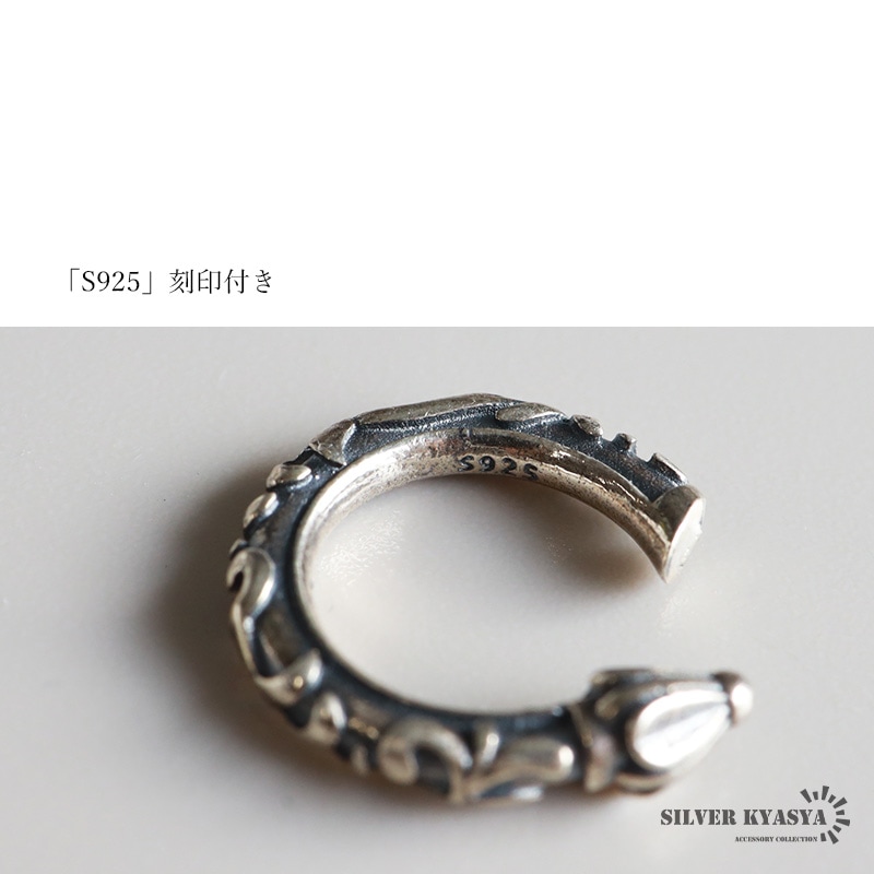 ■ITEM DETAIL スクロールや唐草模様の浮き彫りが映えるイヤーカフ。彫りによる陰影や燻加工も相まってゴシックな雰囲気溢れるスタイル。 ■SILVER925素材 シルバー925は、銀含有率(純度)92.5%を示し、一般的に純銀として扱われています。サビや劣化等がほとんどなく金属アレルギーも出にくいとされており、アクセサリーとして重宝される金属です。 | |