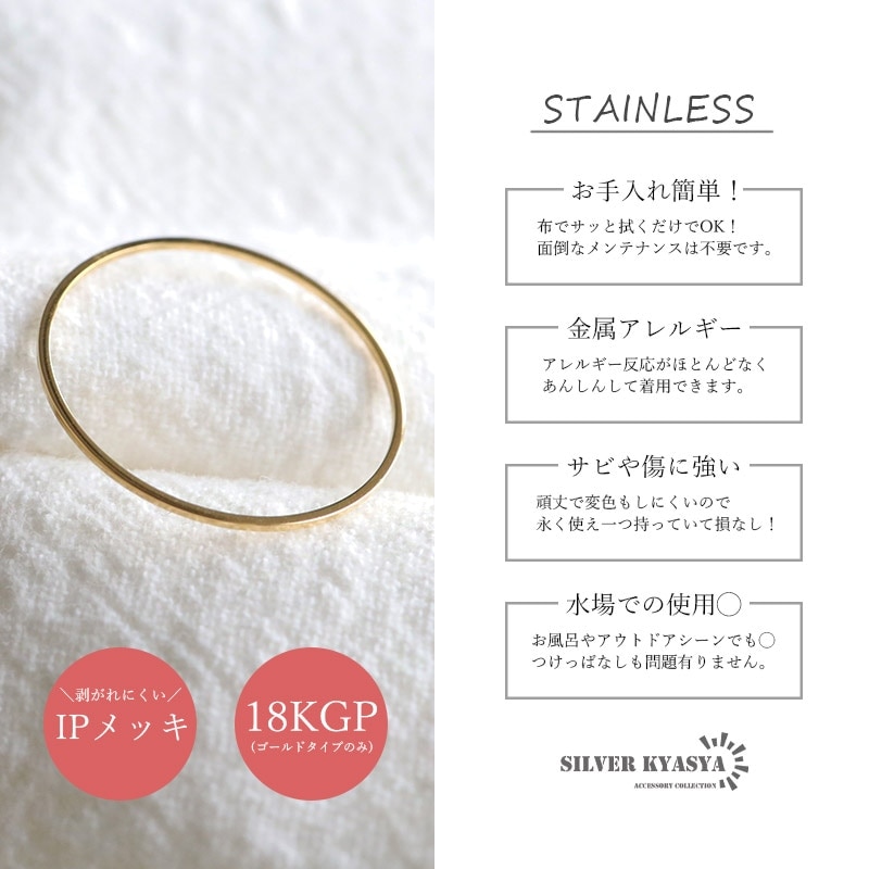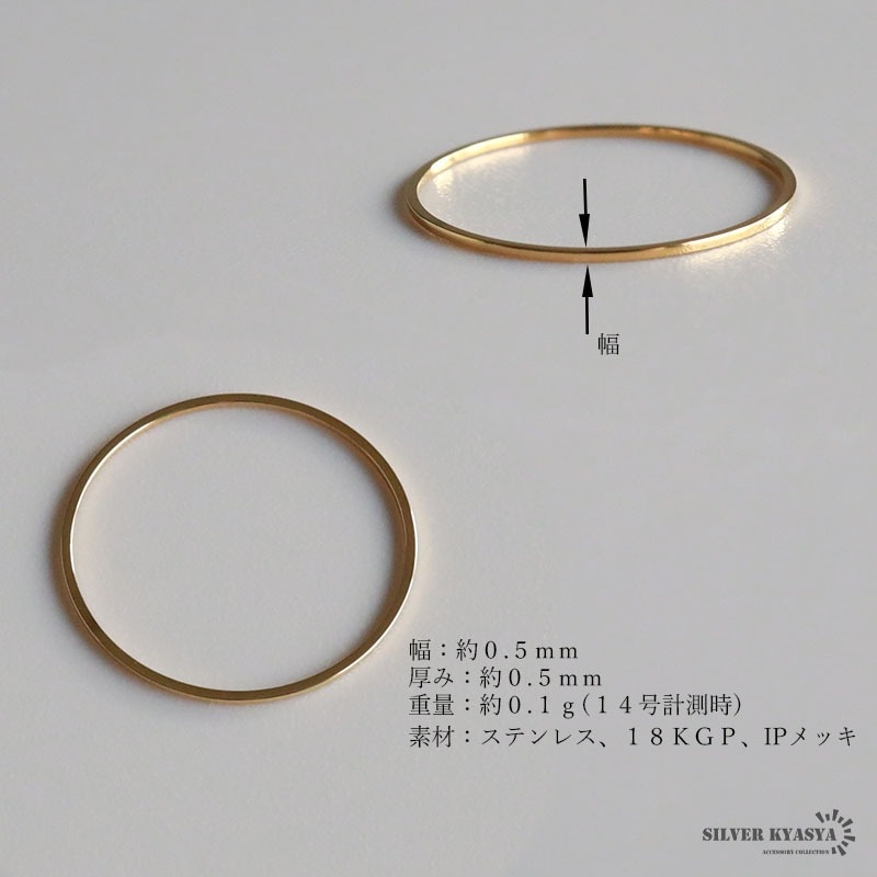■ITEM DETAIL 幅が”0.5mm”と超極細のシンプル平打ちリング。繊細に仕上げた、細身の「面」が上質でさりげない輝きを放ちます。他のリングとの組み合わせや同じリングを重ね付けしても◎。 ■ステンレス素材を使用 金属部分は頑丈なことで知られるステンレス素材を採用。耐久性はもちろん耐水性も高く水場での着用も可能。金属アレルギーも出にくいとされている金属です。 | |