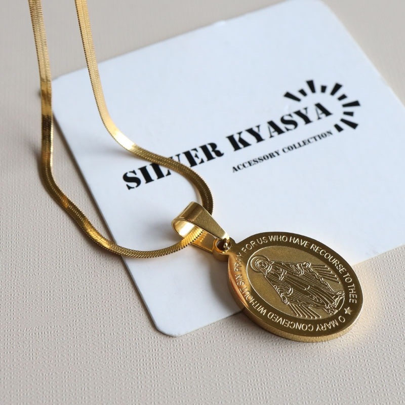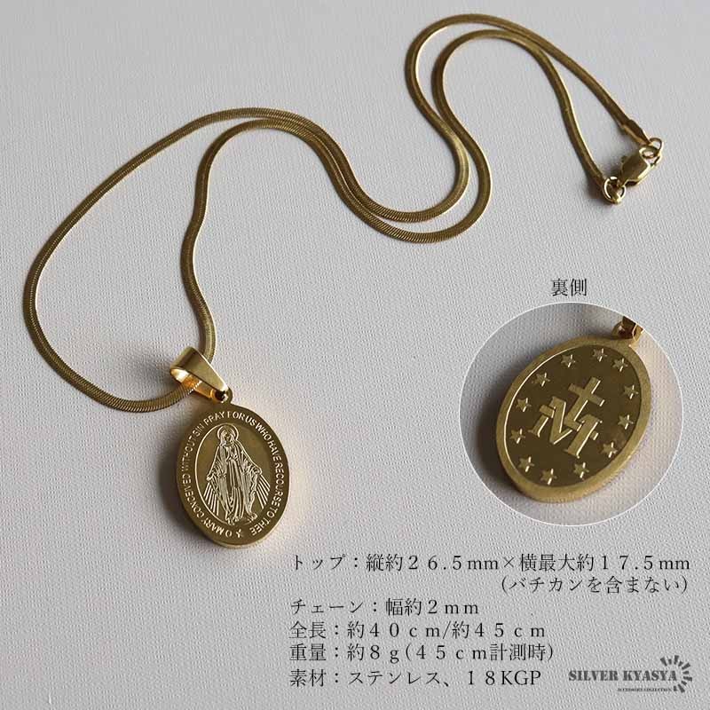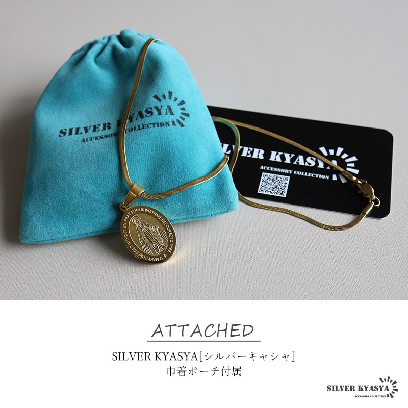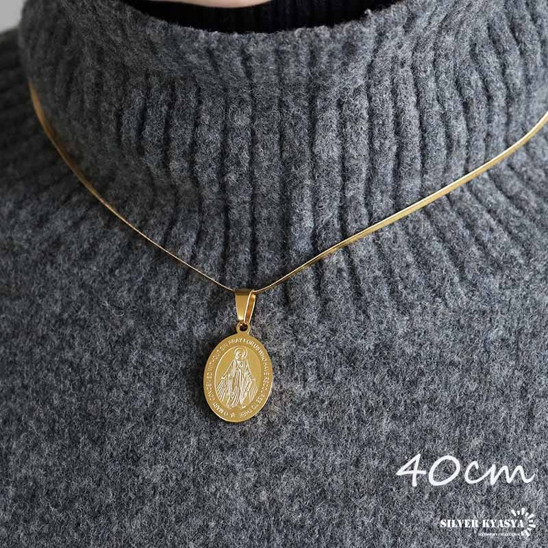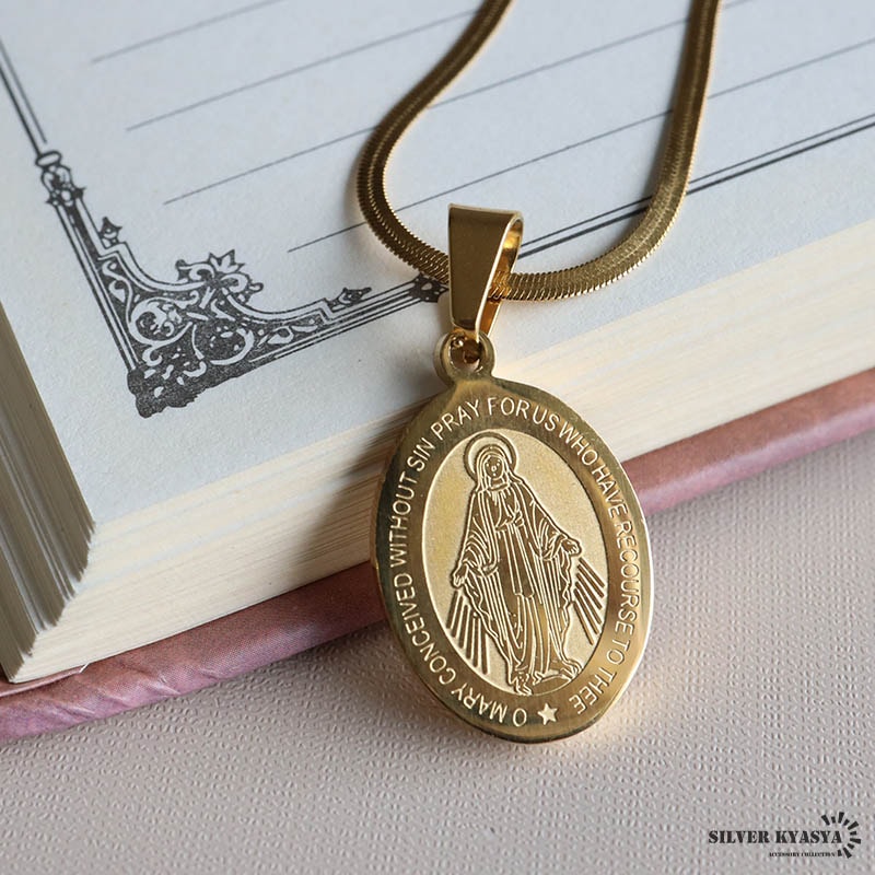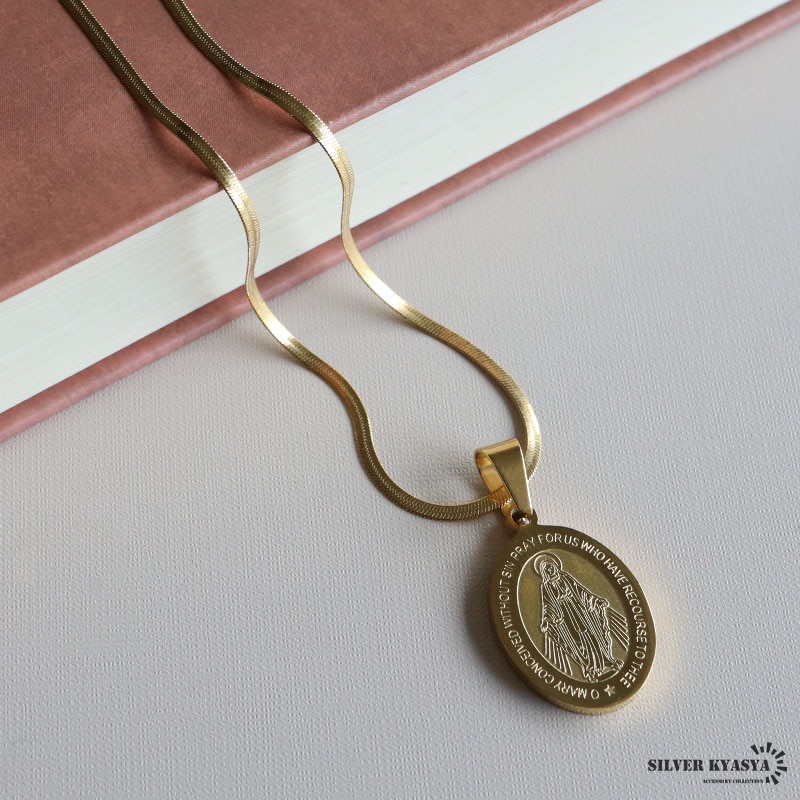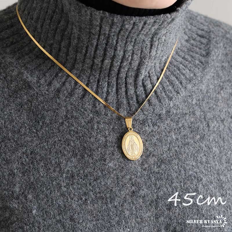 ■ITEM DETAIL 聖母マリアを描いたコイン「不思議のメダイ」をモチーフにしたネックレス。メダイの表面は鏡面仕上げのような光沢感があります。華奢でさりげなさのあるスネークチェーンがマリアコインと相性がとても良いです。 ■ステンレス素材を使用 金属部分は頑丈なことで知られるステンレス素材を採用。耐久性はもちろん耐水性も高く水場での着用も可能。金属アレルギーも出にくいとされている金属です。 | |