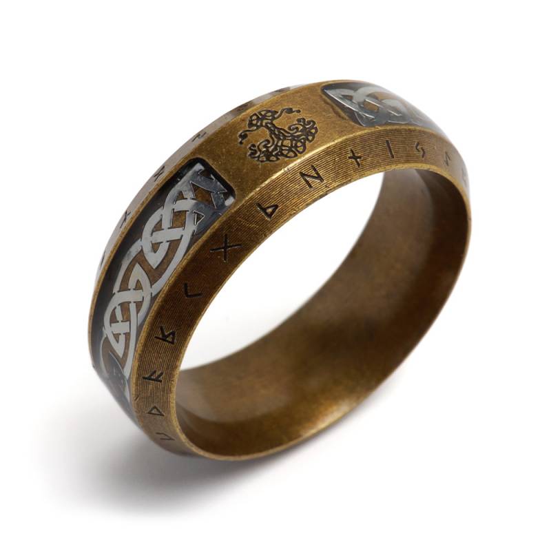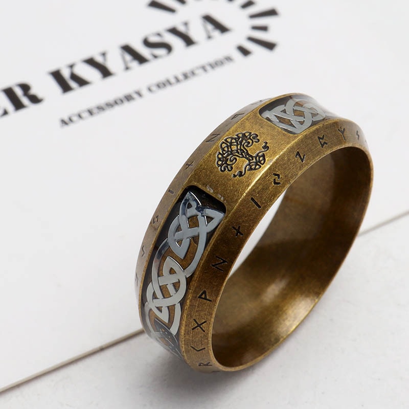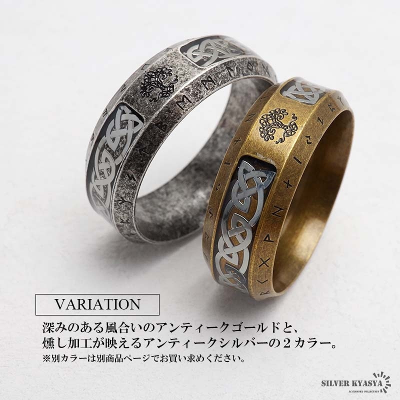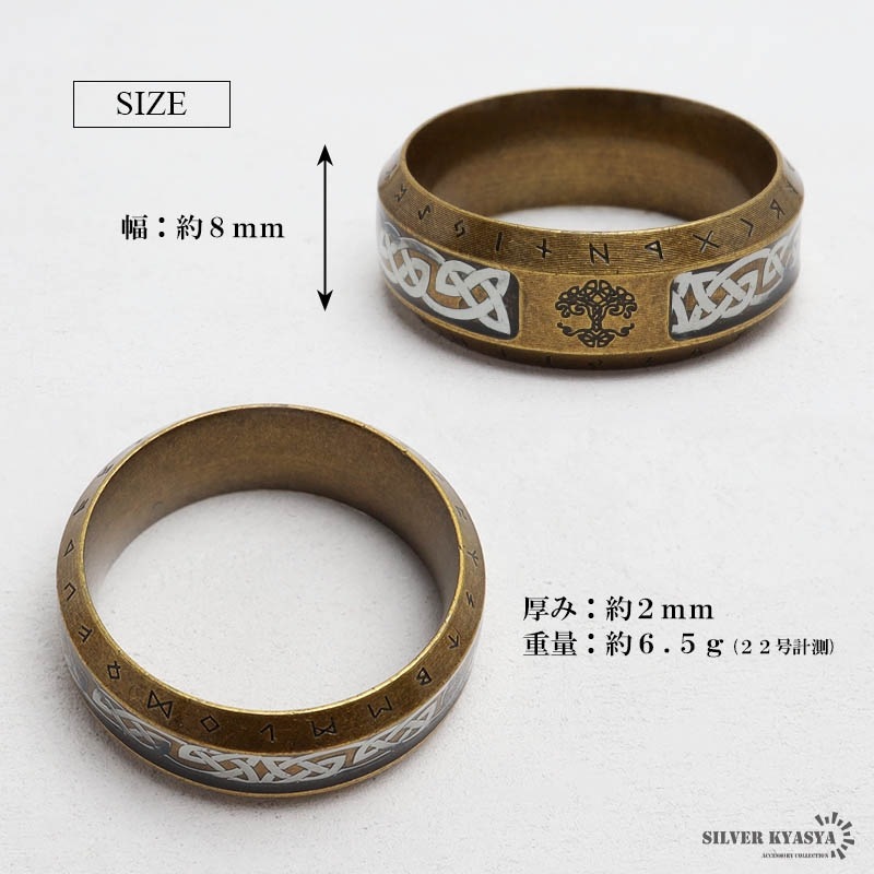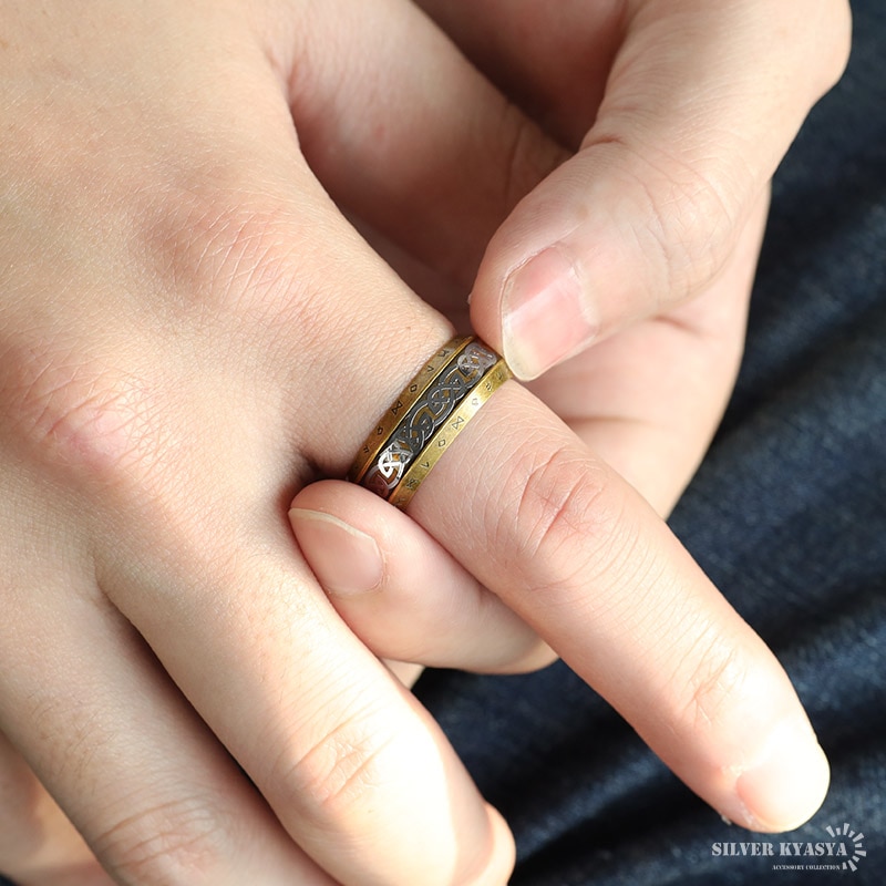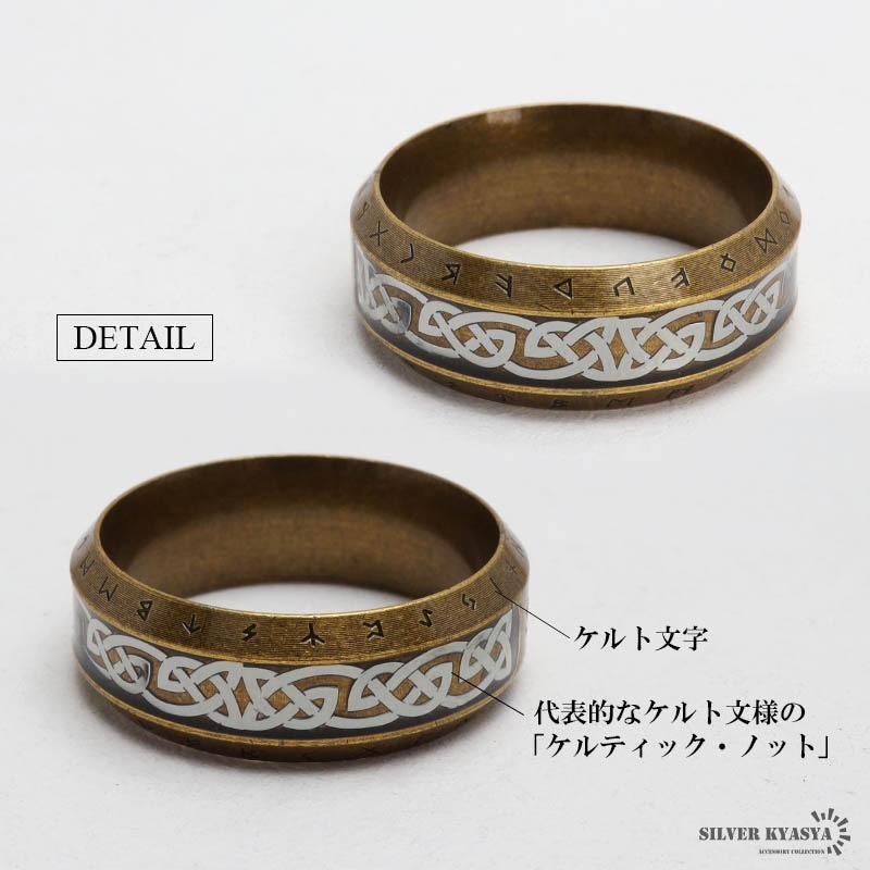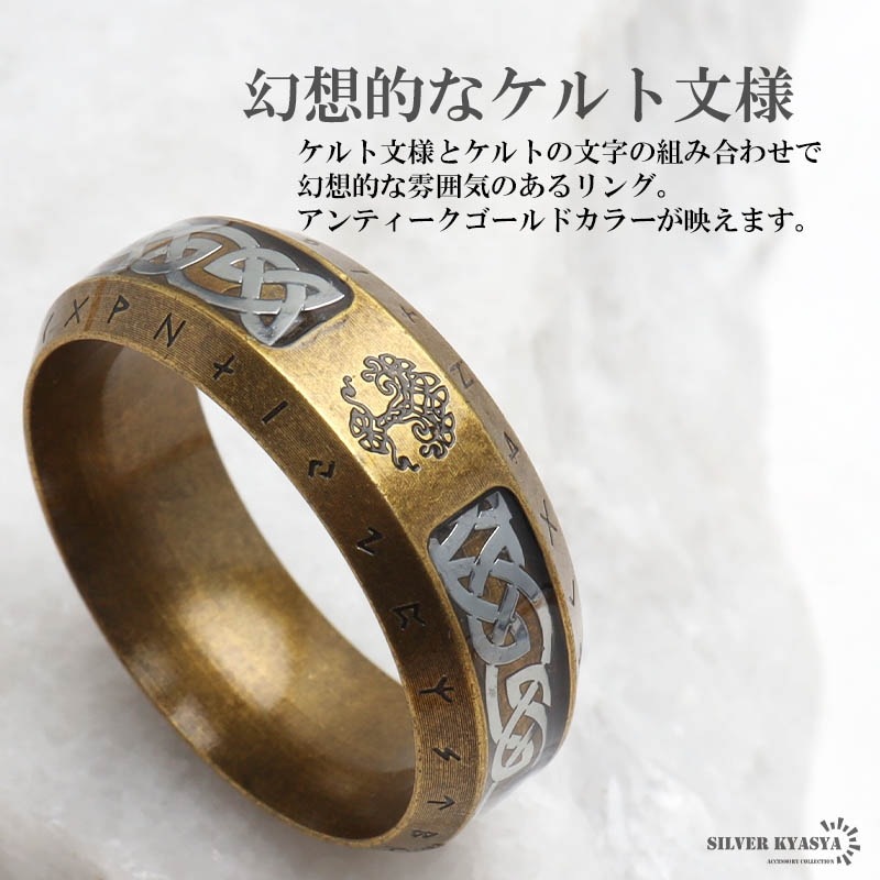 ■幻想的なケルト文様 ケルト文様とケルト文字の組み合わせで幻想的な雰囲気のあるリング。アンティークゴールドカラーが映えます。 ■ステンレス素材を使用 金属部分は頑丈なことで知られるステンレス素材を採用。耐久性はもちろん耐水性も高く水場での着用も可能。金属アレルギーも出にくいとされている金属です。 | |