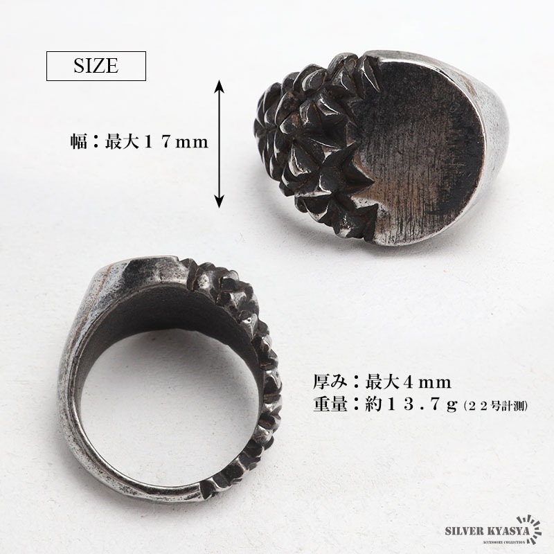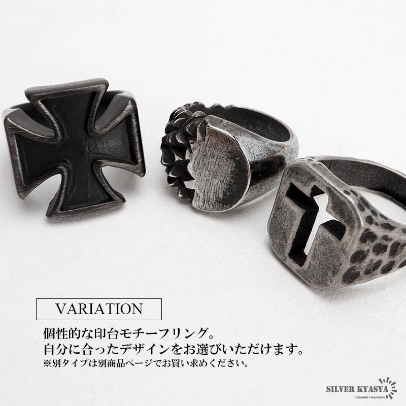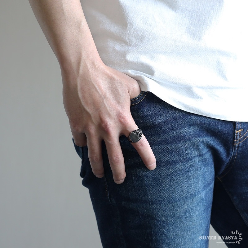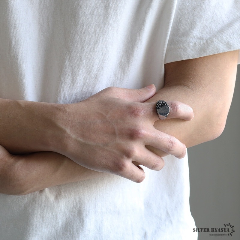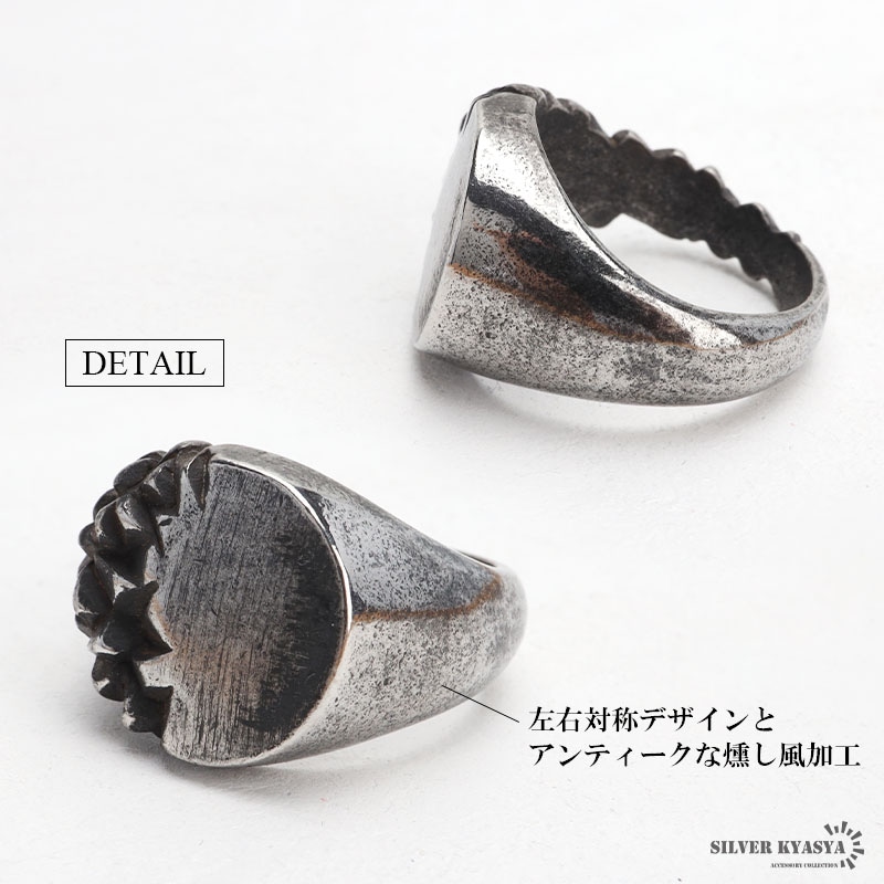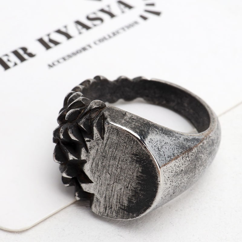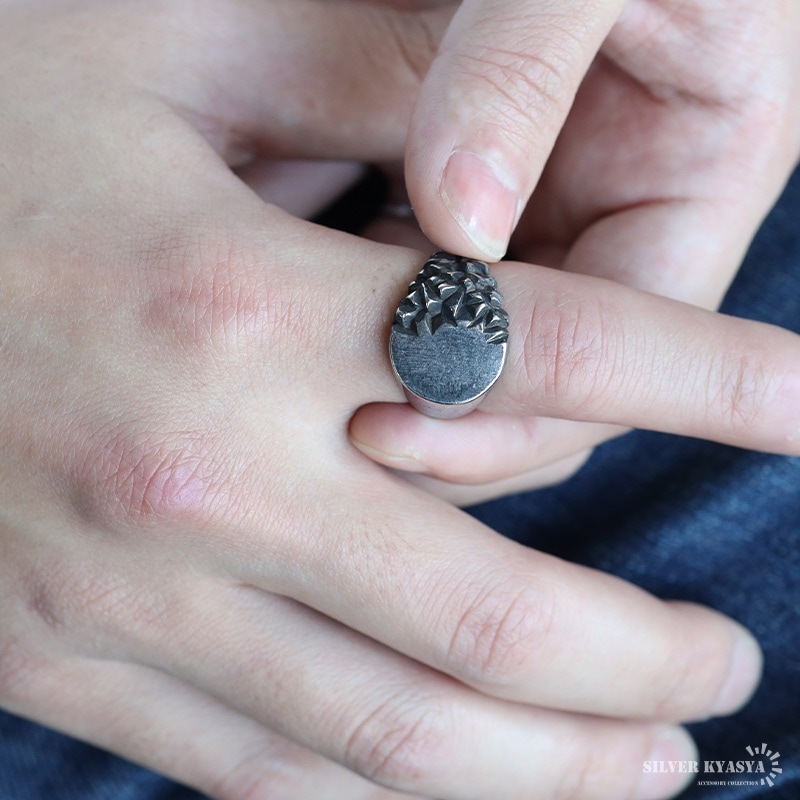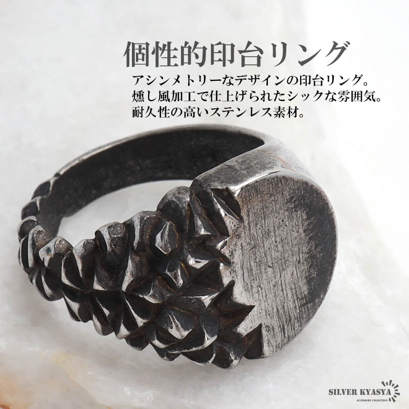 ■個性的印台リング アシンメトリーなデザインの印台リング。燻し風加工で仕上げられたシックな雰囲気。耐久性の高いステンレス素材。 ■ステンレス素材を使用 金属部分は頑丈なことで知られるステンレス素材を採用。耐久性はもちろん耐水性も高く水場での着用も可能。金属アレルギーも出にくいとされている金属です。 | |