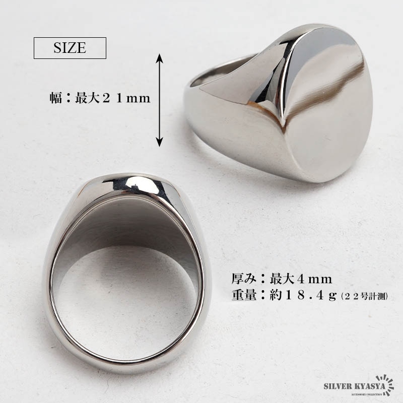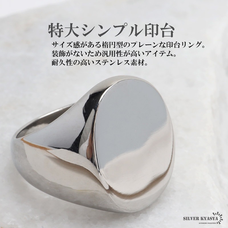 ■特大シンプル印台 サイズ感がある楕円型のプレーンな印台リング。装飾がないため汎用性が高いアイテム。耐久性の高いステンレス素材。 ■ステンレス素材を使用 金属部分は頑丈なことで知られるステンレス素材を採用。耐久性はもちろん耐水性も高く水場での着用も可能。金属アレルギーも出にくいとされている金属です。 | |