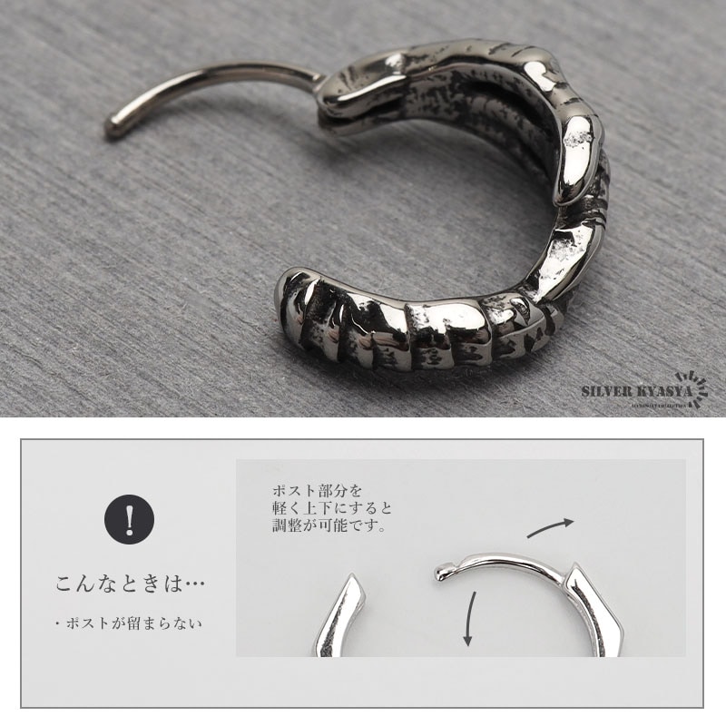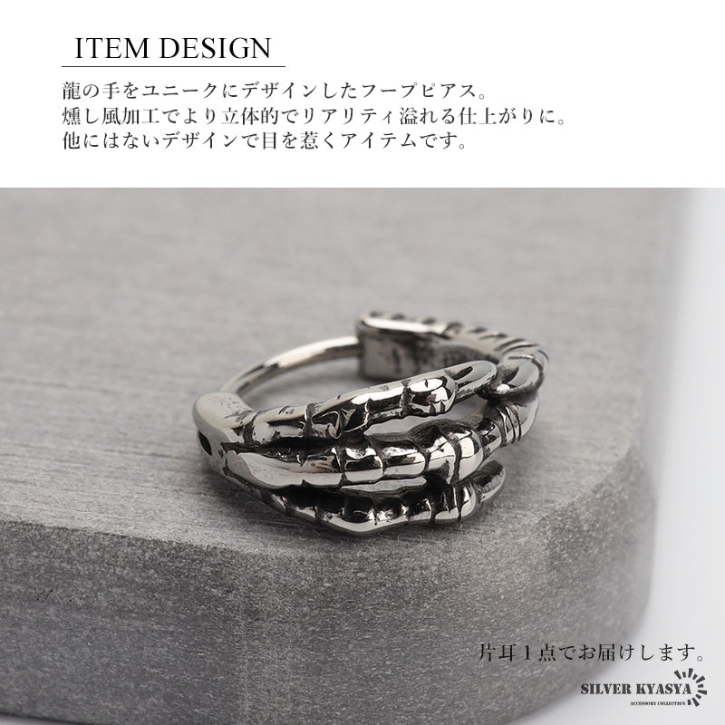 ■ITEM DESIGN 龍の手をユニークにデザインしたフープピアス。燻し風加工でより立体的でリアリティ溢れる仕上がりに。他にはないデザインで目を惹くアイテムです。 ■ステンレス素材を使用 金属部分は頑丈なことで知られるステンレス素材を採用。耐久性はもちろん耐水性も高く水場での着用も可能。金属アレルギーも出にくいとされている金属です。 | |