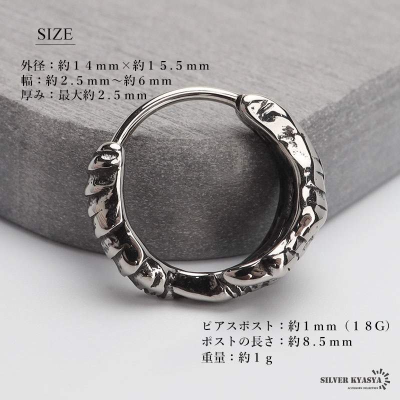 | | 外径:約14mm×約15.5mm 幅:約2.5mm~約6mm 厚み:最大約2.5mm ピアスポスト:約1mm(18G) ポストの長さ:約8.5mm 重量:約1g |