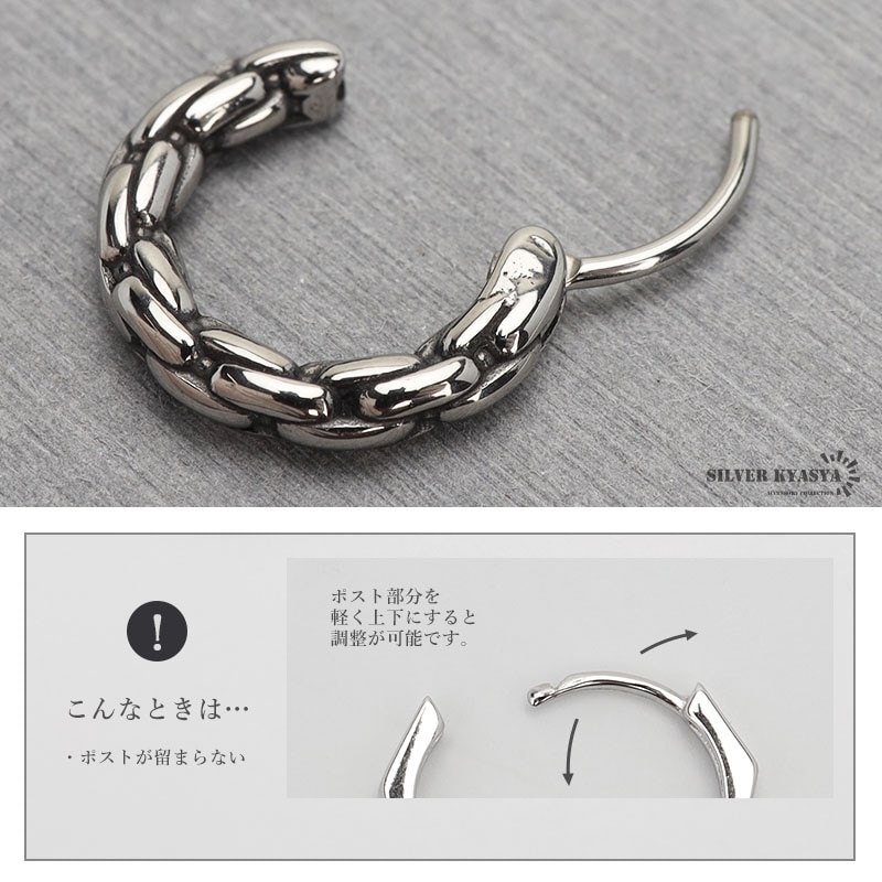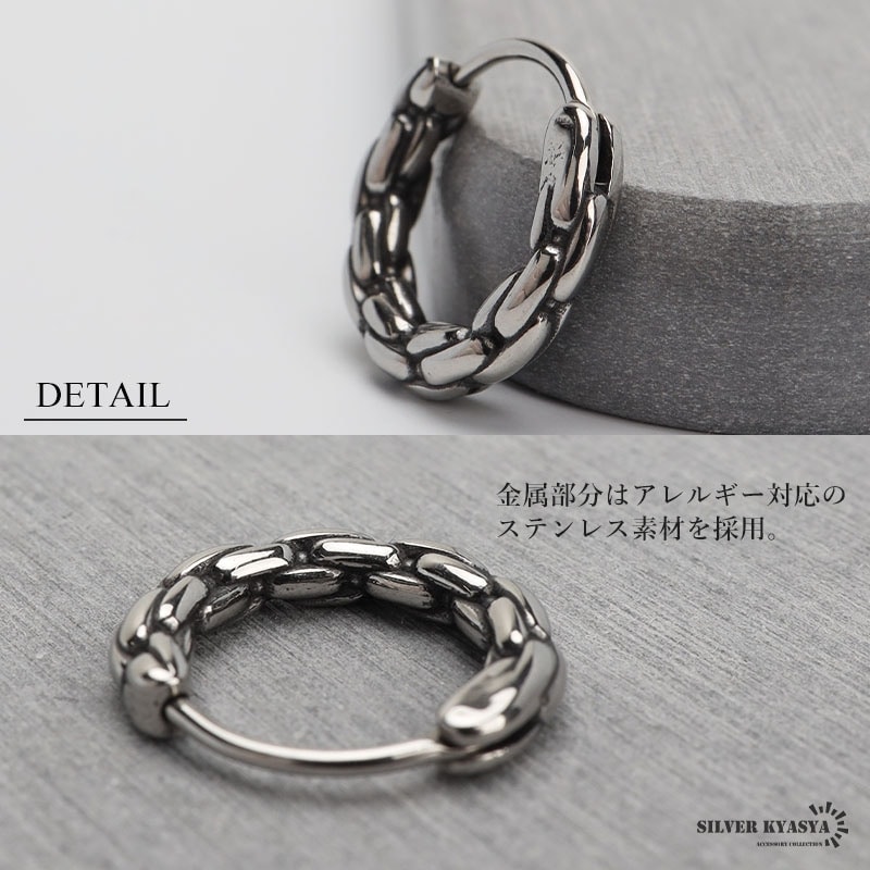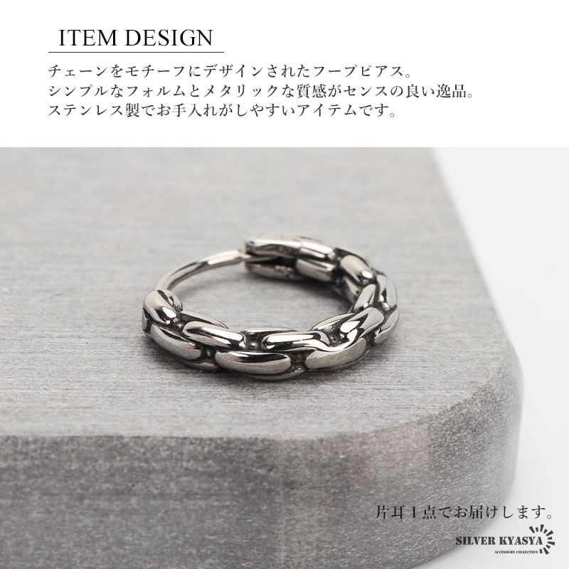 ■ITEM DESIGN チェーンをモチーフにデザインされたフープピアス。シンプルなフォルムとメタリックな質感がセンスの良い逸品。ステンレス製でお手入れがしやすいアイテムです。 ■ステンレス素材を使用 金属部分は頑丈なことで知られるステンレス素材を採用。耐久性はもちろん耐水性も高く水場での着用も可能。金属アレルギーも出にくいとされている金属です。 | |