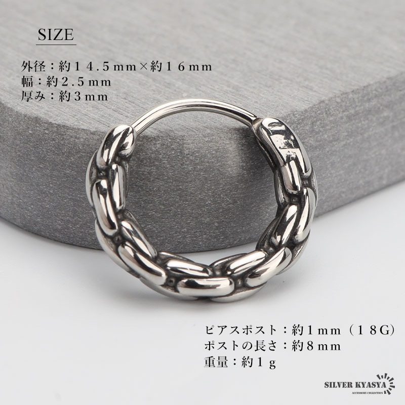 | | 外径:約14.5mm×約16mm 幅:約2.5mm 厚み:約3mm ピアスポスト:約1mm(18G) ポストの長さ:約8mm 重量:約1g |