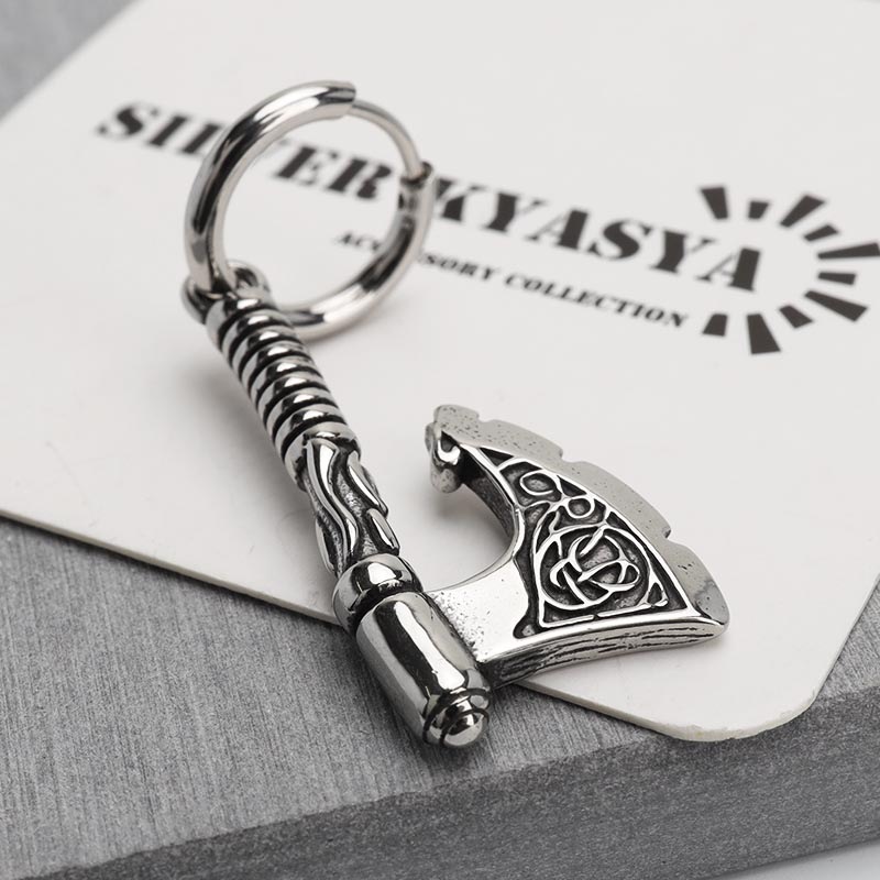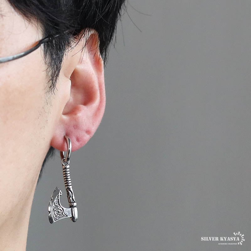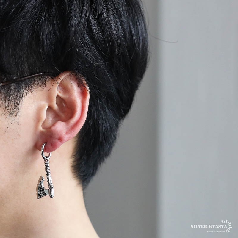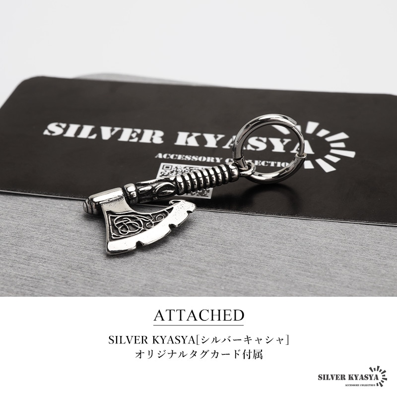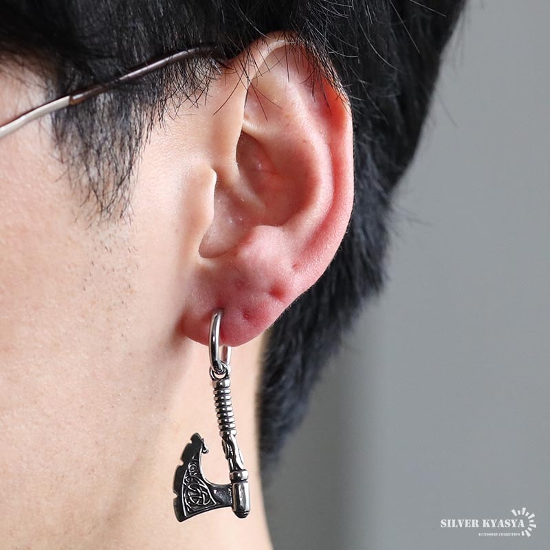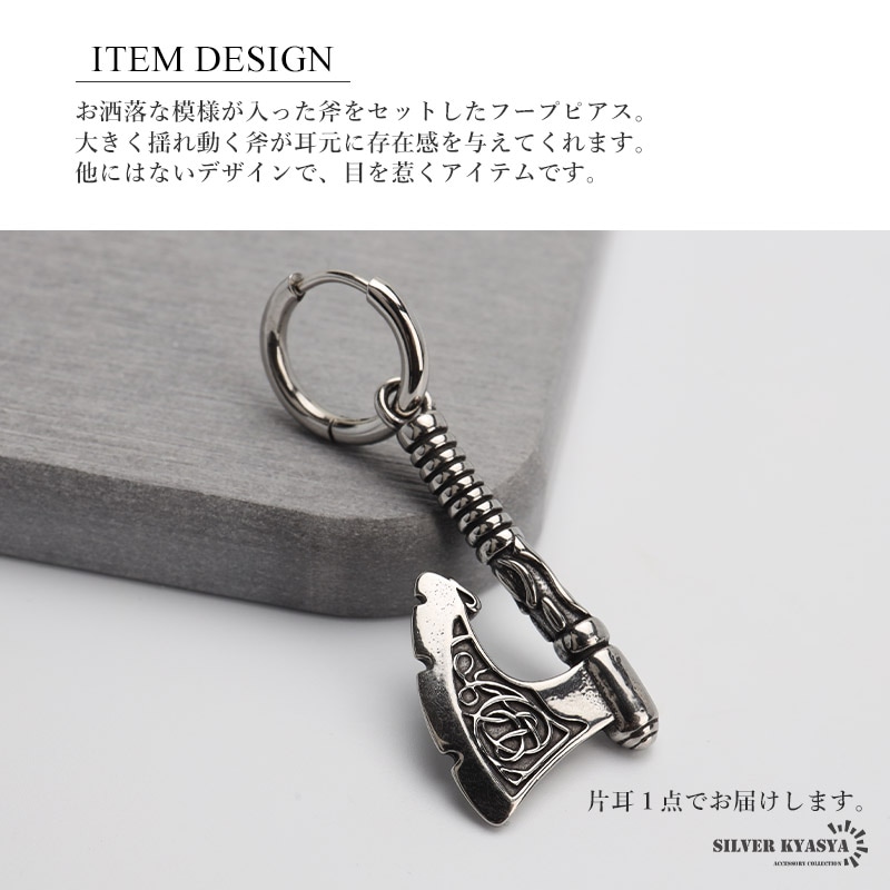 ■ITEM DESIGN お洒落な模様が入った斧をセットしたフープピアス。大きく揺れ動く斧が耳元に存在感を与えてくれます。他にはないデザインで、目を惹くアイテムです。 ■ステンレス素材を使用 金属部分は頑丈なことで知られるステンレス素材を採用。耐久性はもちろん耐水性も高く水場での着用も可能。金属アレルギーも出にくいとされている金属です。 | |