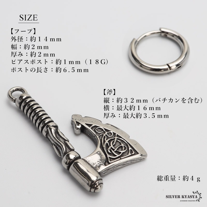 | | 斧:縦最大約32mm(バチカンを含む)、横約16mm、縦最大約3.5mm フープ:外径約14mm、幅約2mm、ピアスポスト約1mm(18G)、ポストの長さ約6.5mm 総重量:約4g |