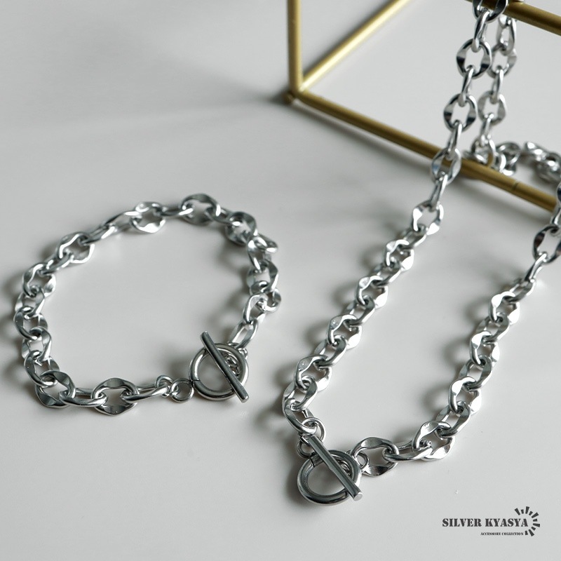 ■ITEM DESIGN 潰したコマがユニークに輝くあずきチェーンのアイテム。留め具は人気のマンテルタイプです。ブレスレットとネックレスのセットで統一感あるスタイルを楽しめます。 ■ステンレス素材を使用 金属部分は頑丈なことで知られるステンレス素材を採用。耐久性はもちろん耐水性も高く水場での着用も可能。金属アレルギーも出にくいとされている金属です。 | |