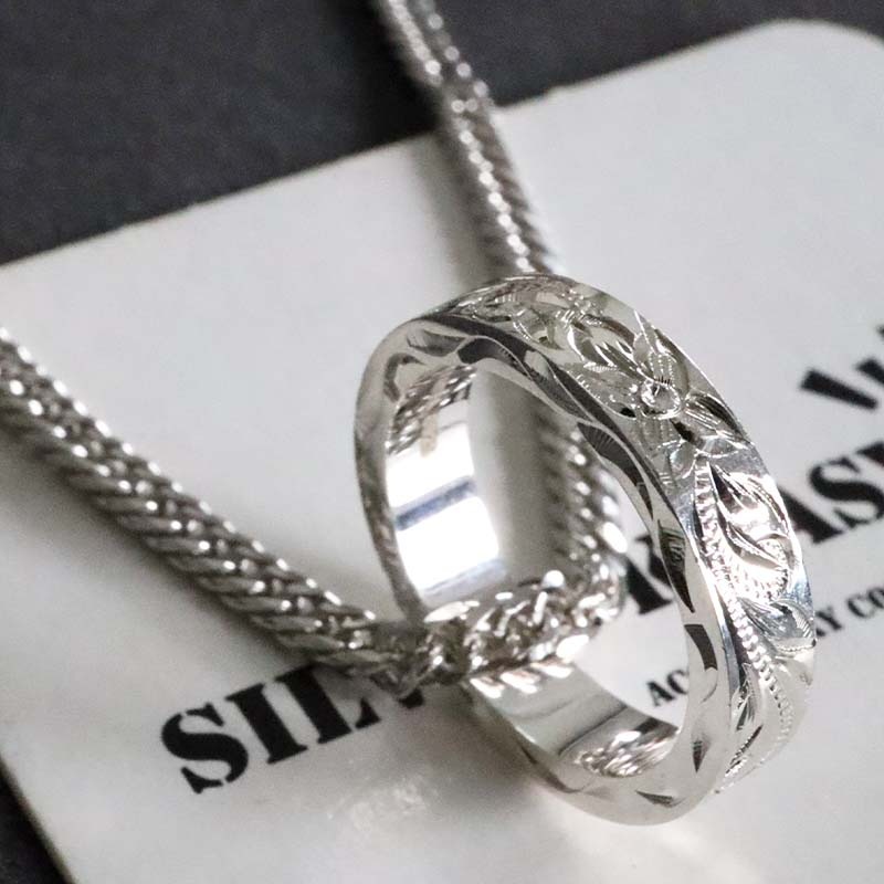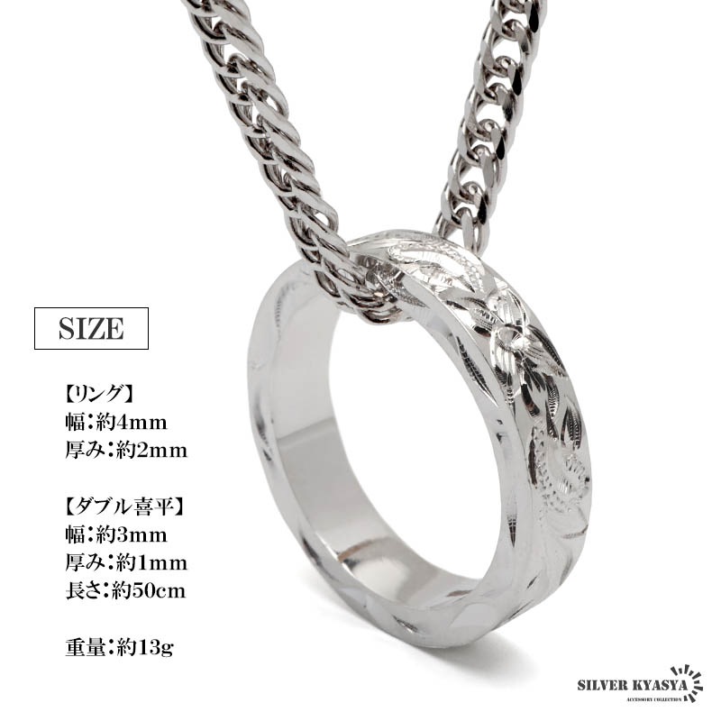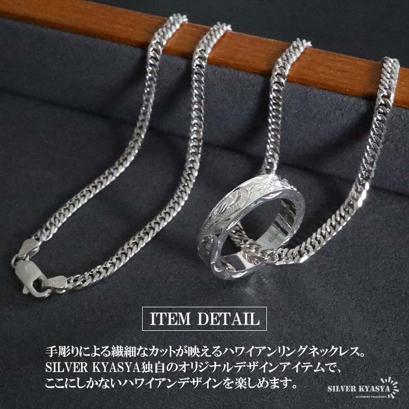 ■ITEM DETAIL 手彫りによる繊細なカットが映えるハワイアンリングネックレス。SILVER KYASYA独自のオリジナルデザインアイテムで、ここにしかないハワイアンデザインを楽しめます。 ■CHAIN 光の反射が美しい6面カットのダブル喜平チェーンを採用。シルバー925素材(S925刻印付き)、留め具はイタリア製で壊れにくく、長持ちします。 ■大人のシルバー925 大人の魅力あふれるシルバー925素材を採用。「925」とは銀の含有率(純度)92.5%を示し、一般的に純銀として扱われます。サビや劣化等がほとんどなく金属アレルギーも出にくいとされており、アクセサリーとしての実用性もある金属です。 | |
