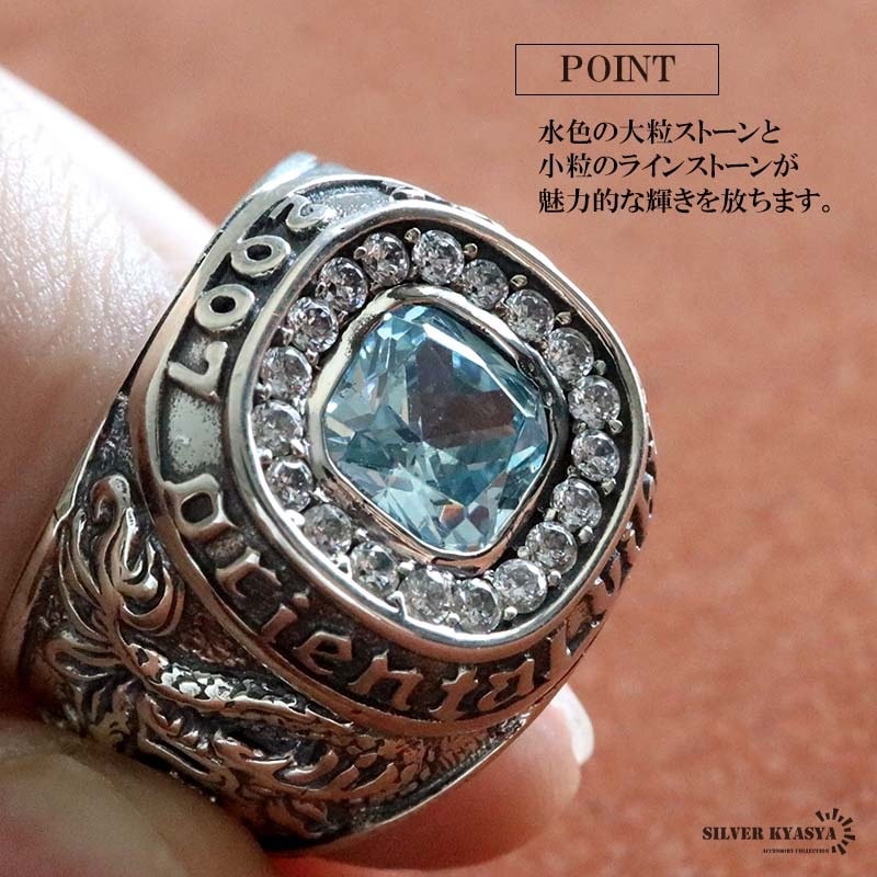 ■ITEM DETAIL 大粒のストーンをセットしたカレッジリング。サイドには龍と虎が刻まれており精巧な逸品。一つ着けるだけで抜群の存在感を放ってくれます。 ■大人のシルバー925 大人の魅力あふれるシルバー925素材を採用。「925」とは銀の含有率(純度)92.5%を示し、一般的に純銀として扱われます。サビや劣化等がほとんどなく金属アレルギーも出にくいとされており、アクセサリーとしての実用性もある金属です。 | |