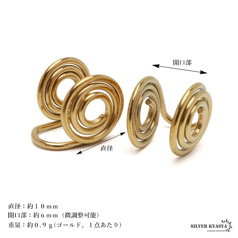 | | 直径:約10mm 開口部:約6mm(微調整可能) 重量:約0.9g(ゴールド、1点あたり) |