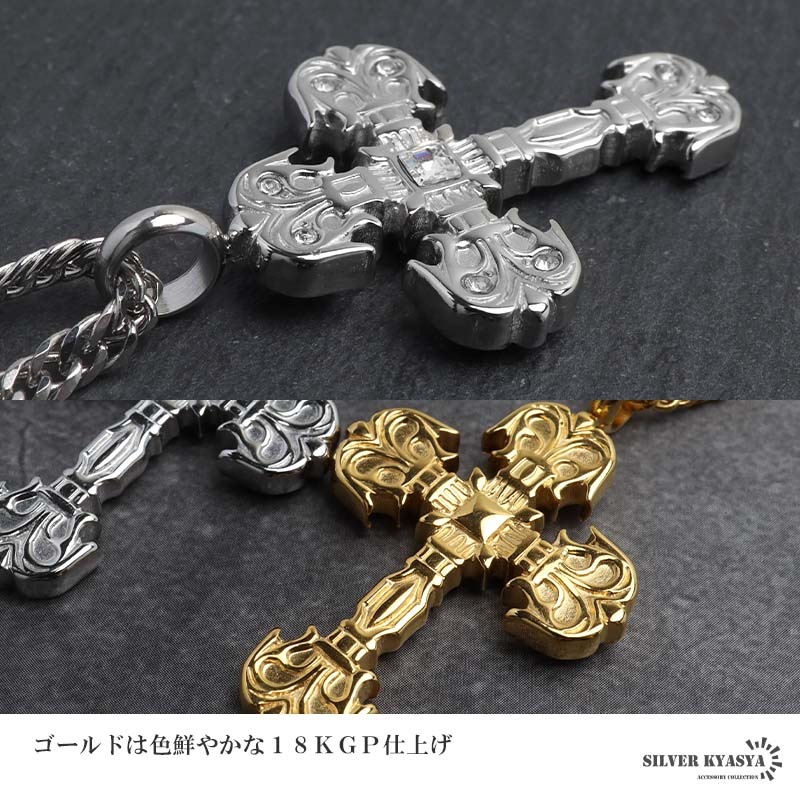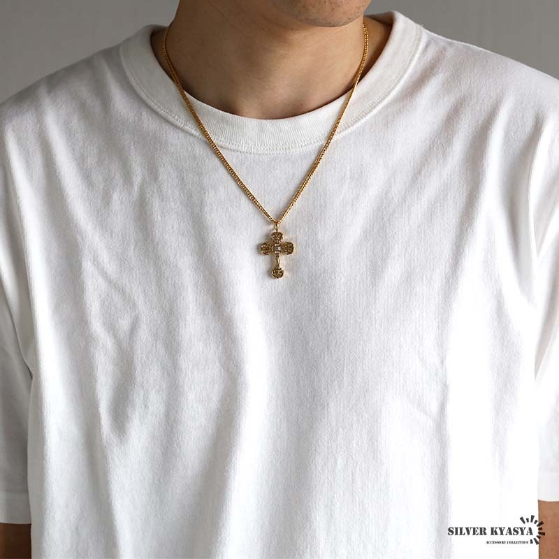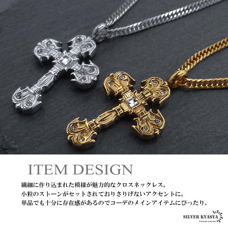 ■ITEM DESIGN 繊細に作り込まれた模様が魅力的なクロスネックレス。小粒のストーンがセットされておりさりげないアクセントに。単品でも十分に存在感があるのでコーデのメインアイテムにぴったり。 ■安心のステンレスアイテム 頑丈でお手入れも簡単なステンレス製アクセサリー。錆びることもなくサッと拭くだけメンテもかんたん。金属アレルギーが出にくいのもポイントです。 | |