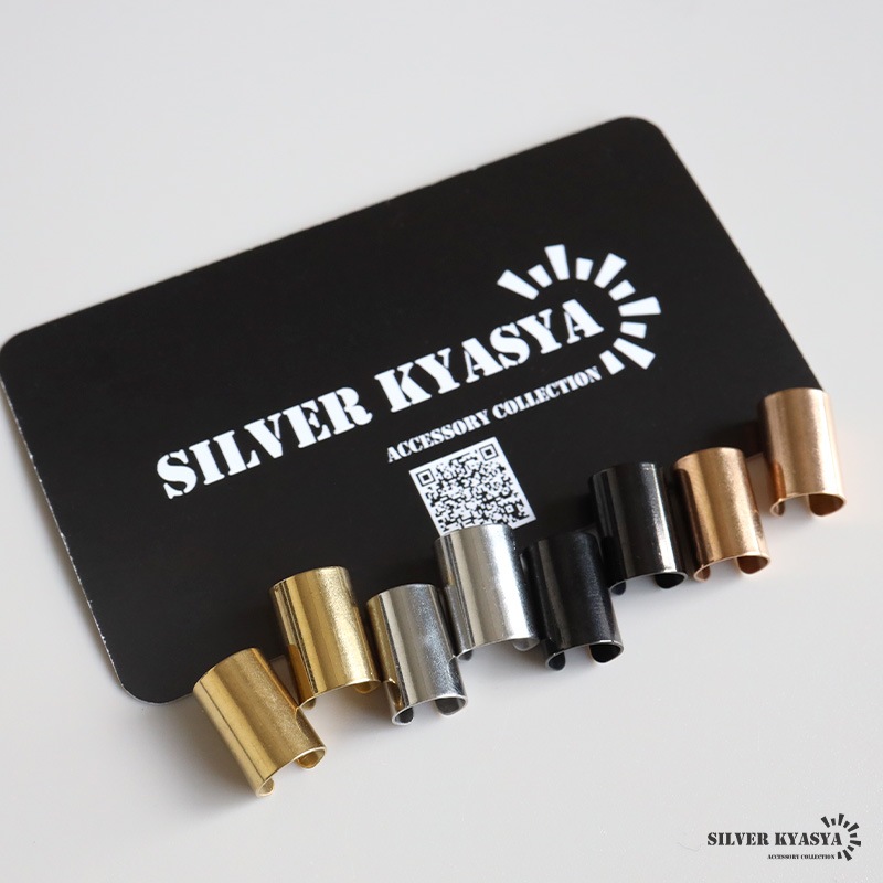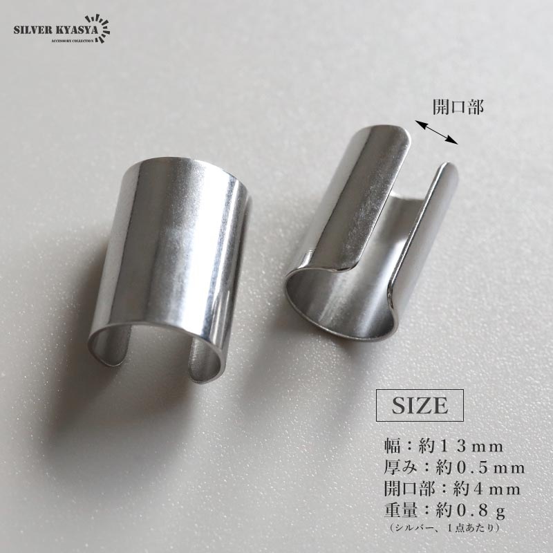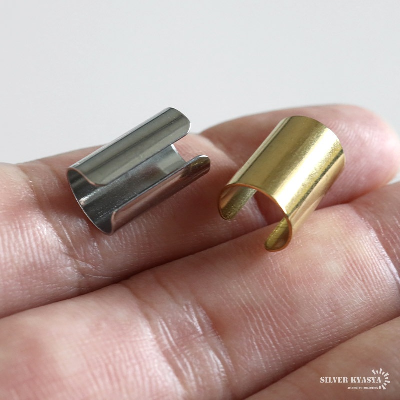 | | 幅:約13mm 厚み:約0.5mm 開口部:約4mm 重量:約0.8g(シルバー、1点あたり) |