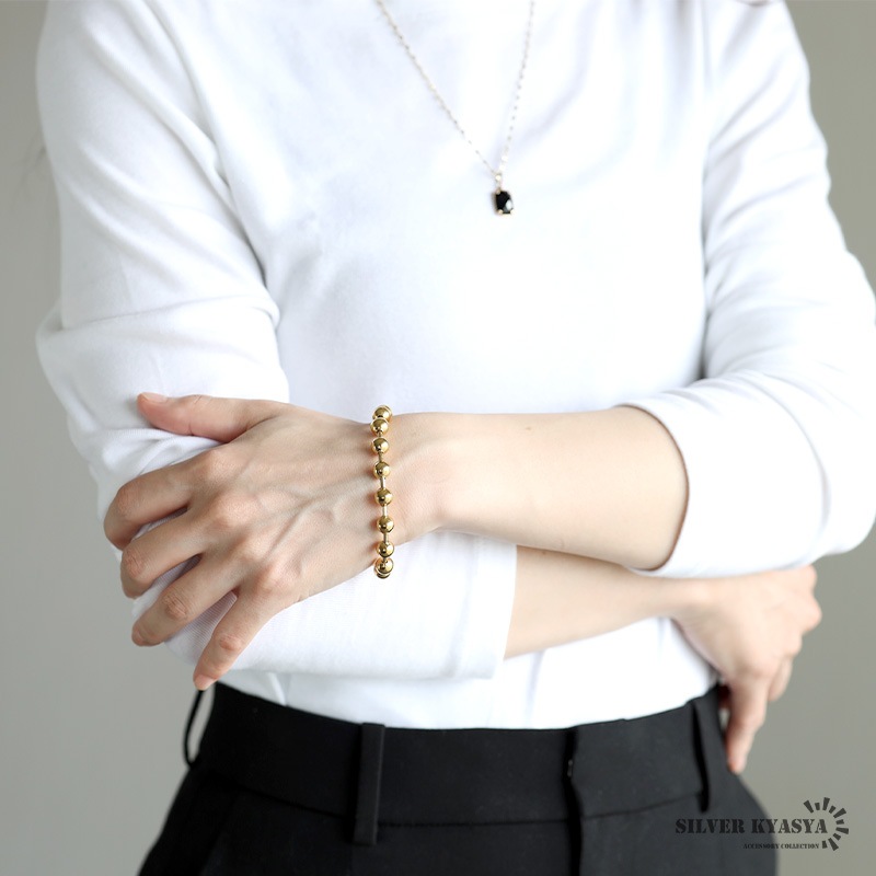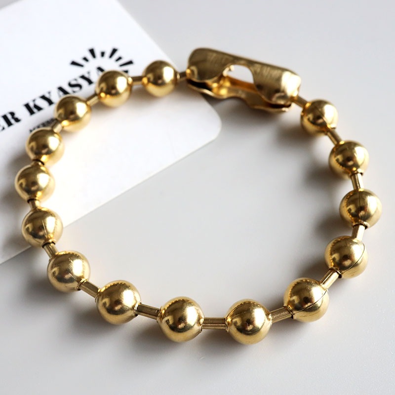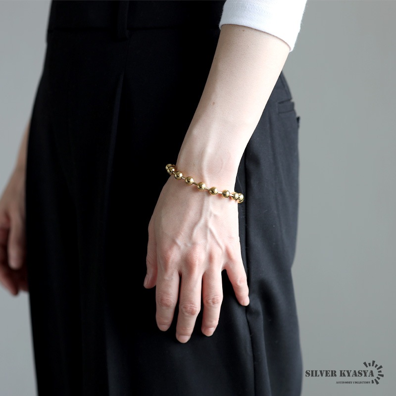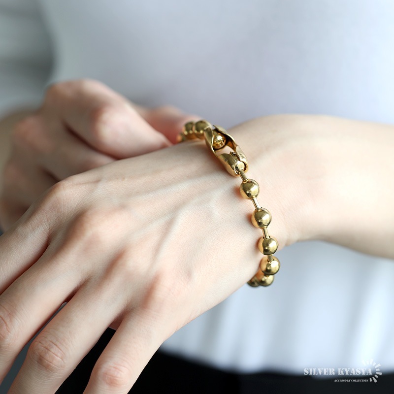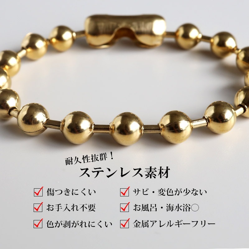 ■ITEM DESIGN 幅8mmのラージサイズのボールを使用した、シンプルなボールチェーンブレスレット。まるくてコロンとした見た目が可愛い、どんなシーンにも合わせやすいアイテムです。 ■安心のステンレスアイテム チェーンは頑丈でお手入れも簡単なステンレス製アクセサリー。錆びることもなくサッと拭くだけメンテもかんたん。金属アレルギーが出にくいのもポイントです。 | |