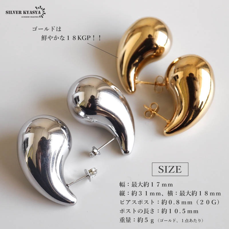 | | 幅:最大約17mm 縦:約31mm 横:最大約18mm ピアスポスト:約0.8mm(20G) ポストの長さ:約10.5mm 重量:約5g(ゴールド、1点あたり) |