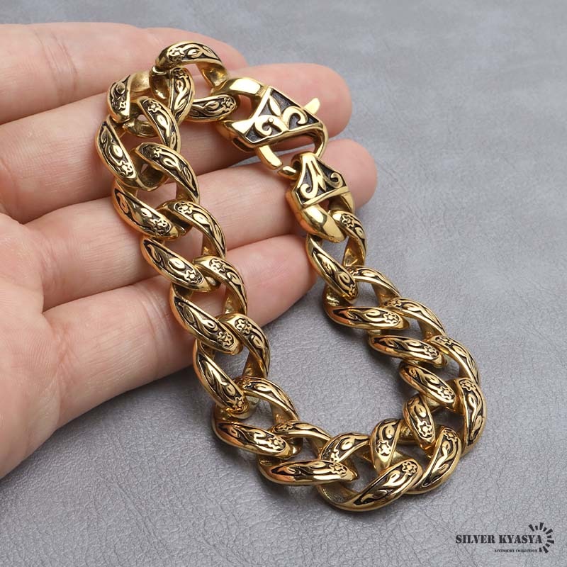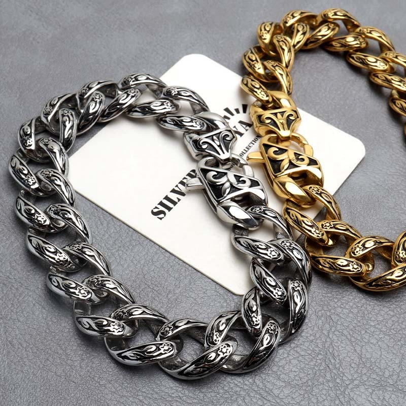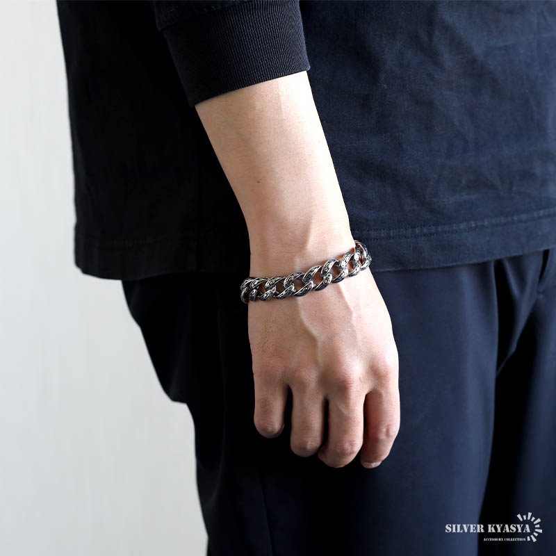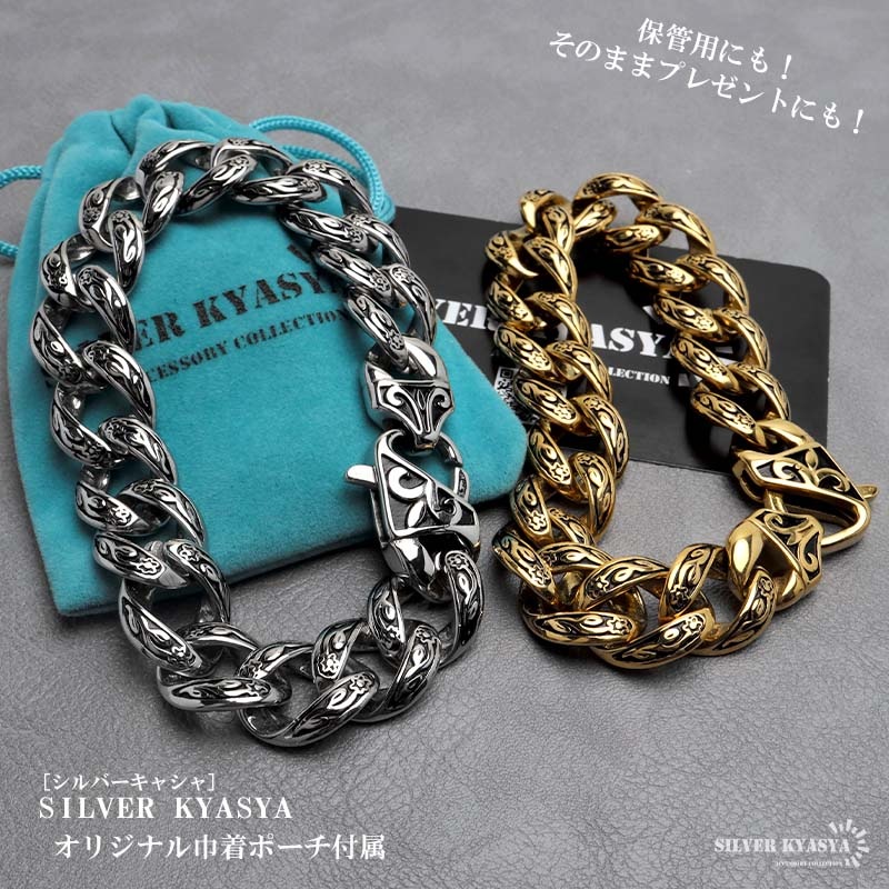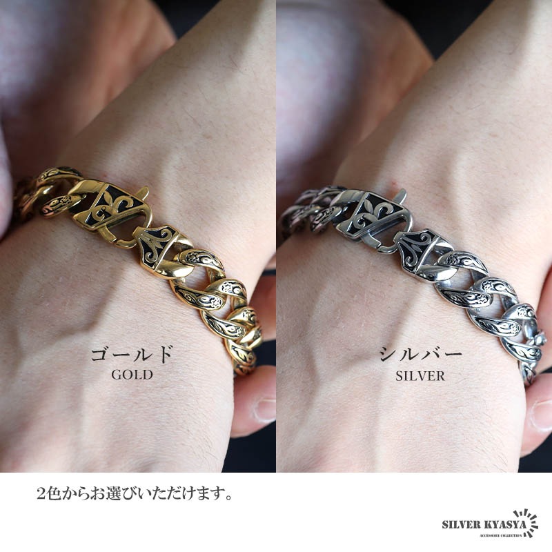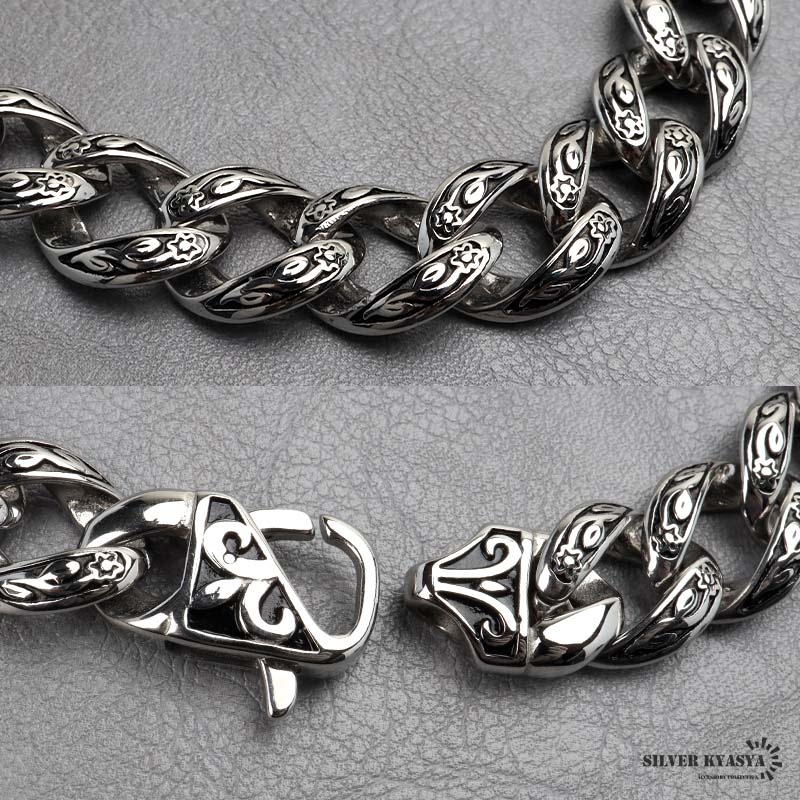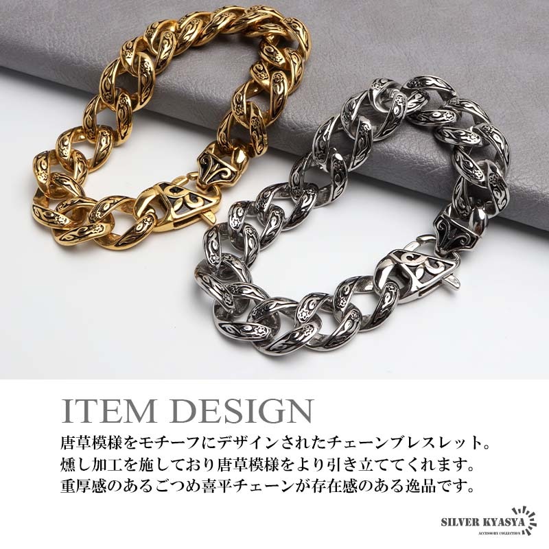 ■ITEM DESIGN 唐草模様をモチーフにデザインされたチェーンブレスレット。燻し加工を施しており唐草模様をより引き立ててくれます。重厚感のあるごつめ喜平チェーンが存在感のある逸品です。 ■安心のステンレスアイテム 頑丈でお手入れも簡単なステンレス製アクセサリー。錆びることもなくサッと拭くだけメンテもかんたん。金属アレルギーが出にくいのもポイントです。 | |