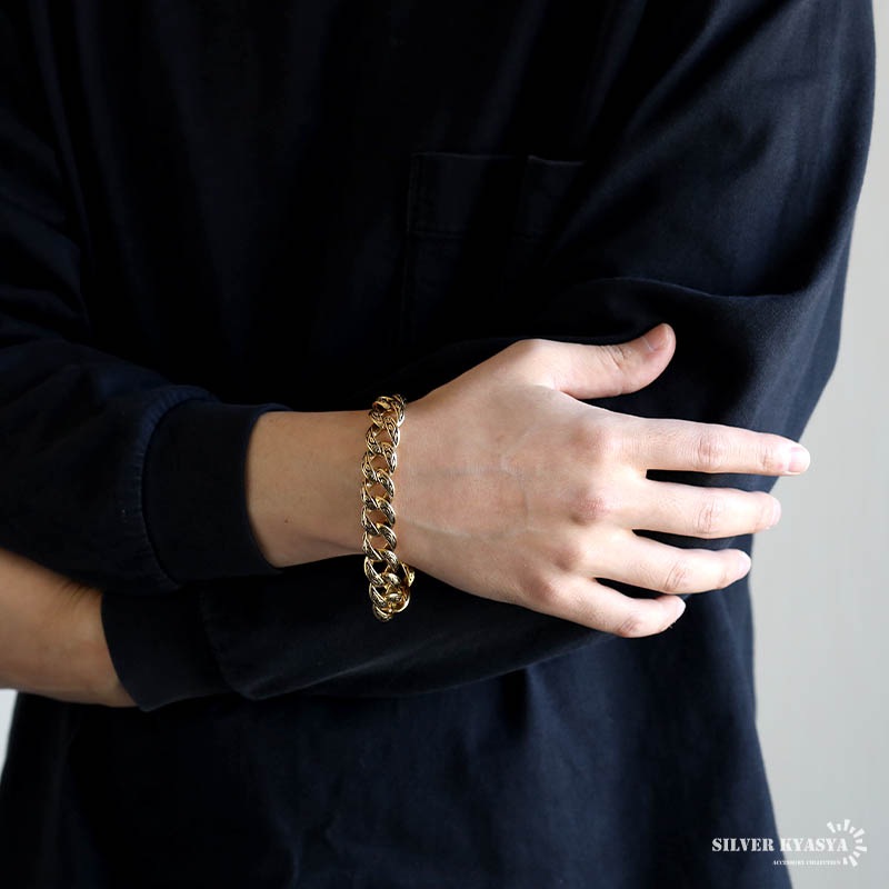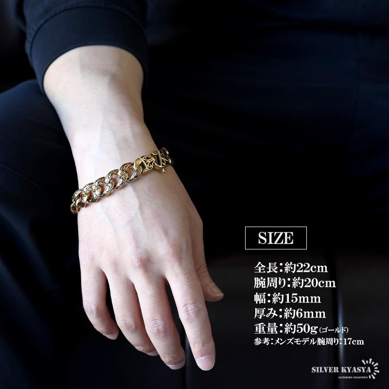 | | 全長:約22cm 腕周り:約20cm 幅:約15mm 厚み:約6mm 重量:約50g(ゴールド) |