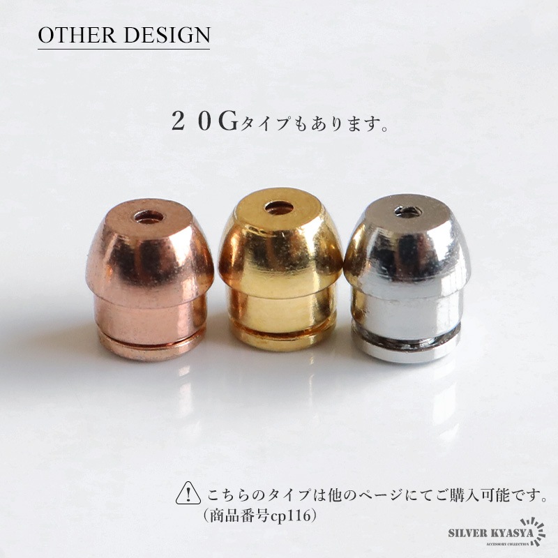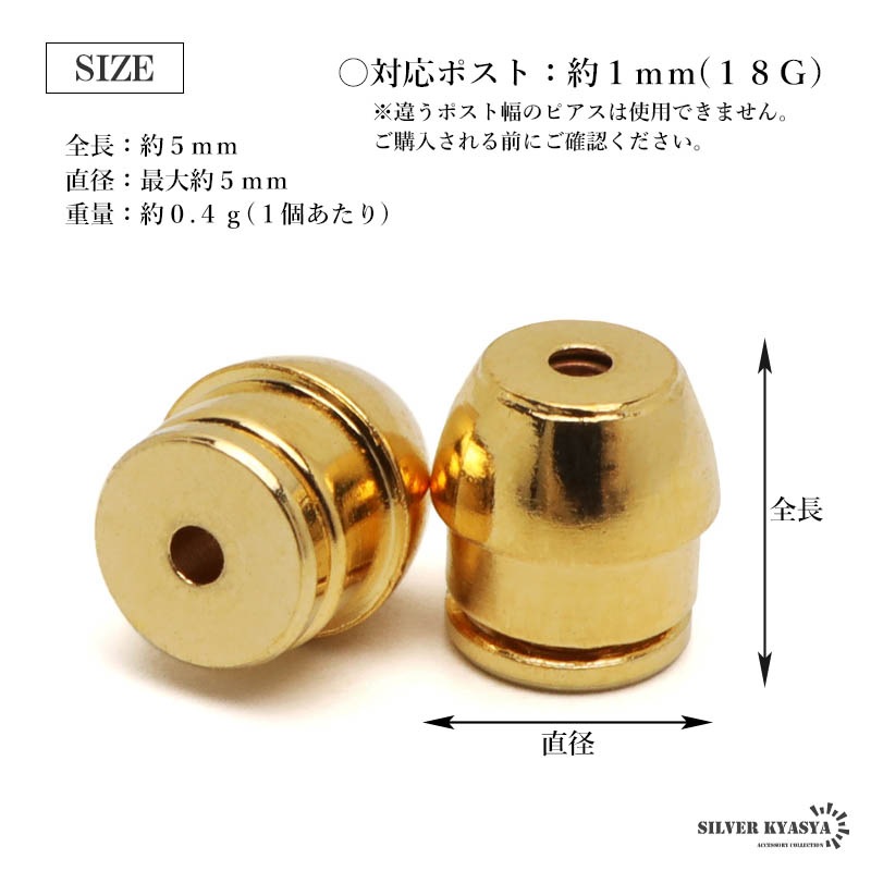 | | 全長:約5mm 直径:最大約5mm 対応ポスト:約1mm(18G) 重量:約0.4g(1個あたり) |