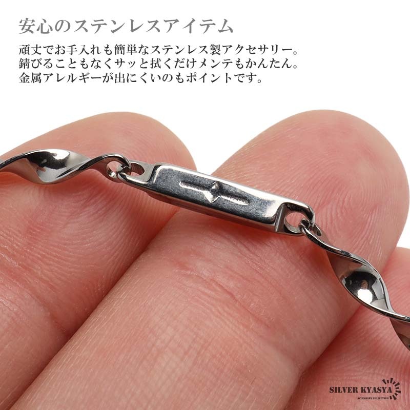 ■ITEM DESIGN ツイストモチーフをチェーンにデザインしたブレスレット。シンプルながらも他にはない表情を持ったアイテム。安心のステンレス素材なので日常使いにぴったりです。 ■安心のステンレスアイテム 頑丈でお手入れも簡単なステンレス製アクセサリー。錆びることもなくサッと拭くだけメンテもかんたん。金属アレルギーが出にくいのもポイントです。 | |