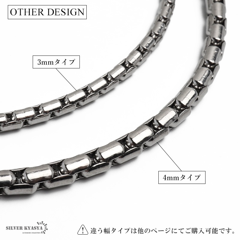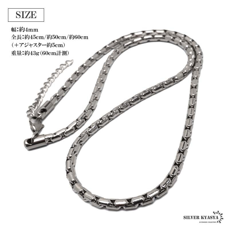 | | 幅:約4mm 全長:約45cm/約50cm/約60cm(+アジャスター約5cm) 重量:約43g(60cm計測) |