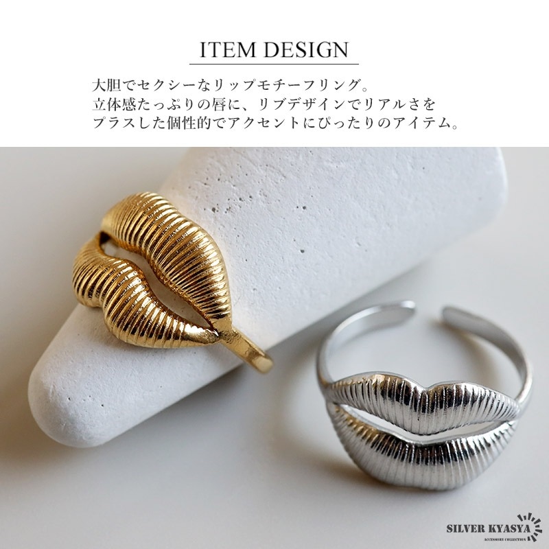■ITEM DETAIL 大胆でセクシーなリップモチーフリング。立体感たっぷりの唇に、リブデザインでリアルさをプラスした個性的でアクセントにぴったりのアイテム。 ■ステンレス素材 金属部分は頑丈なことで知られるステンレス素材を採用。耐久性はもちろん耐水性も高く水場での着用も可能。金属アレルギーも出にくいとされている金属です。 | |