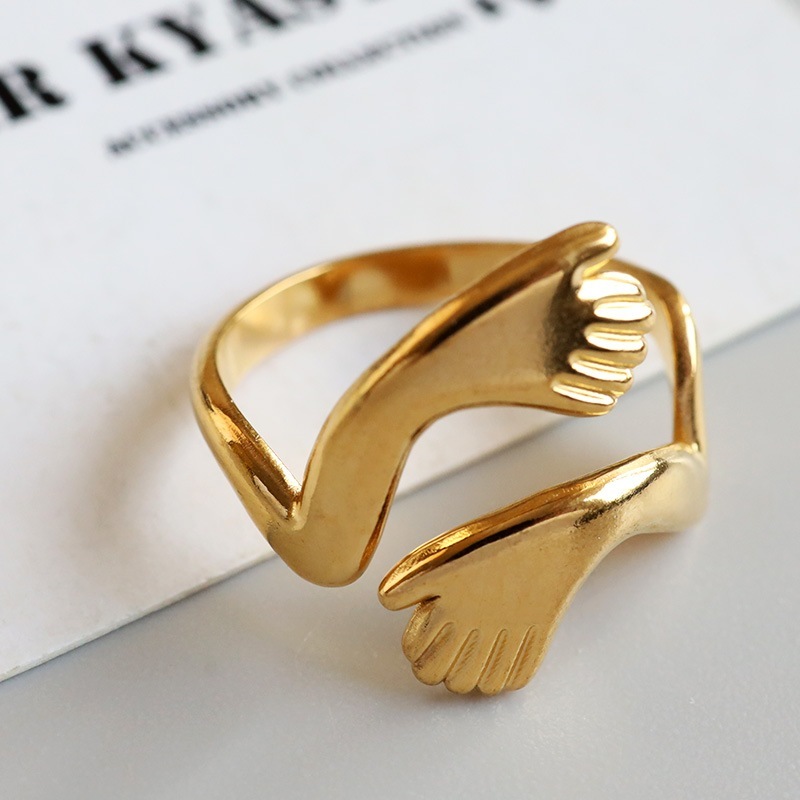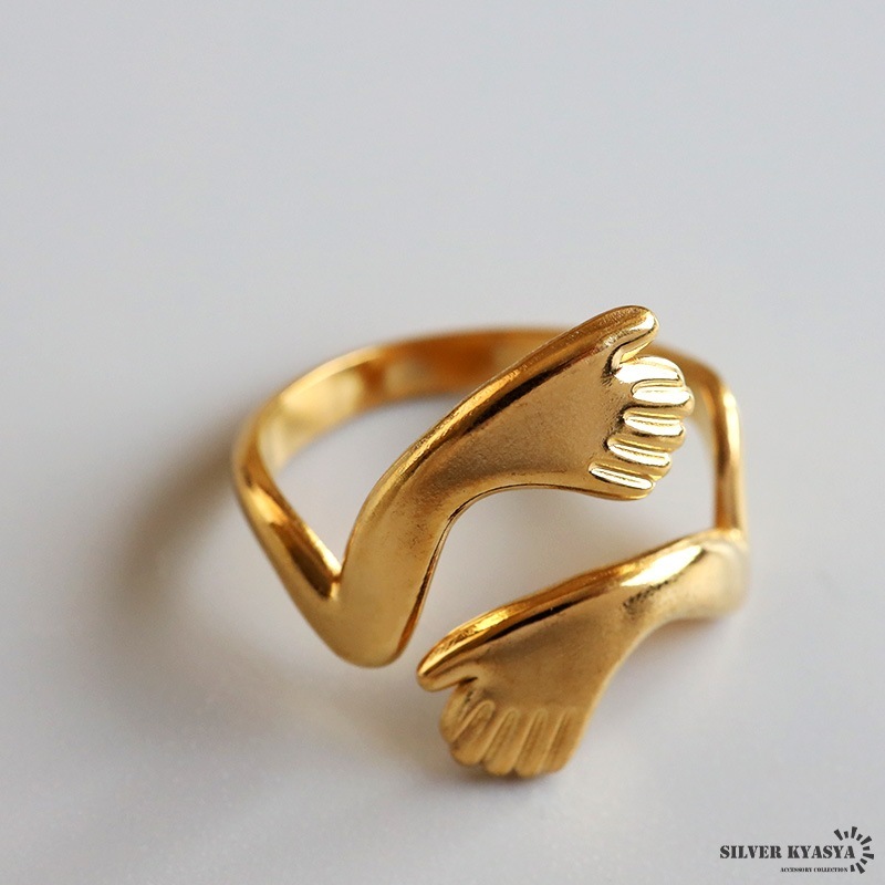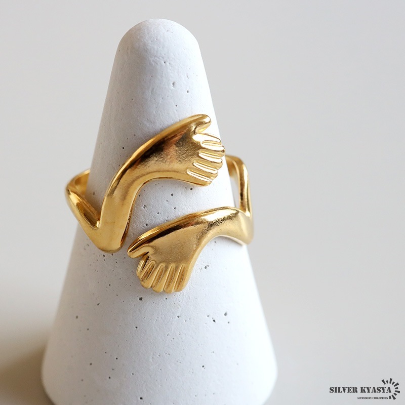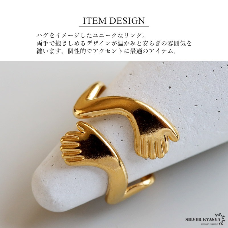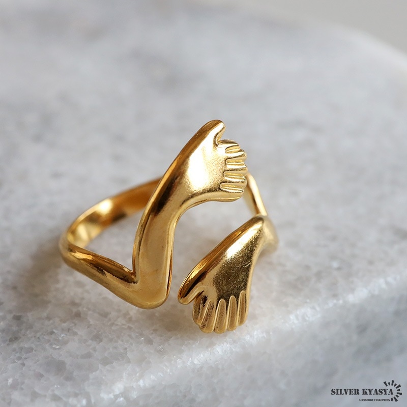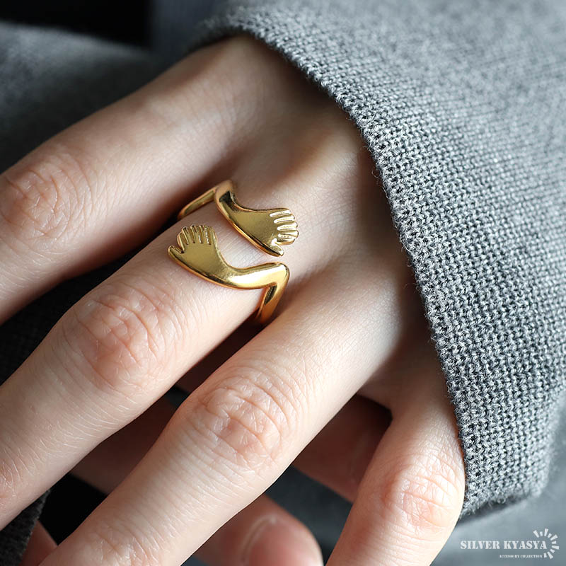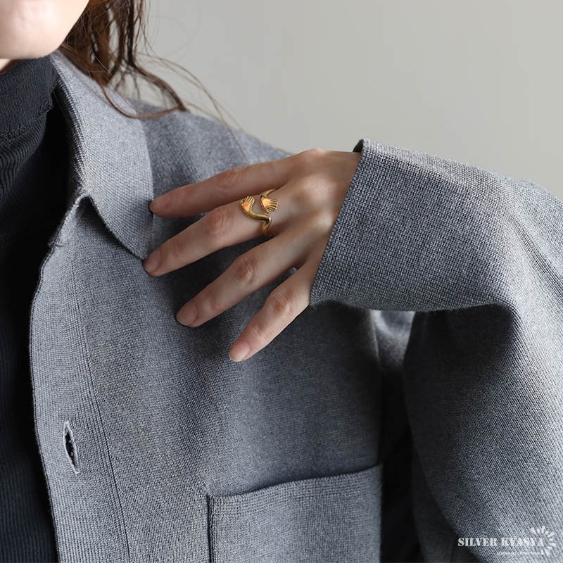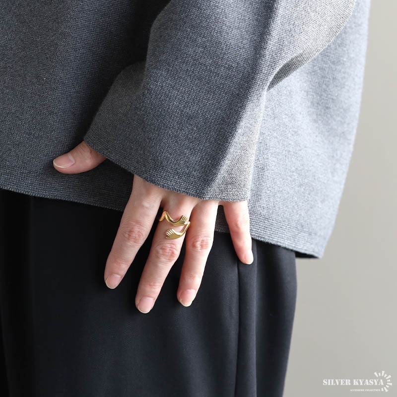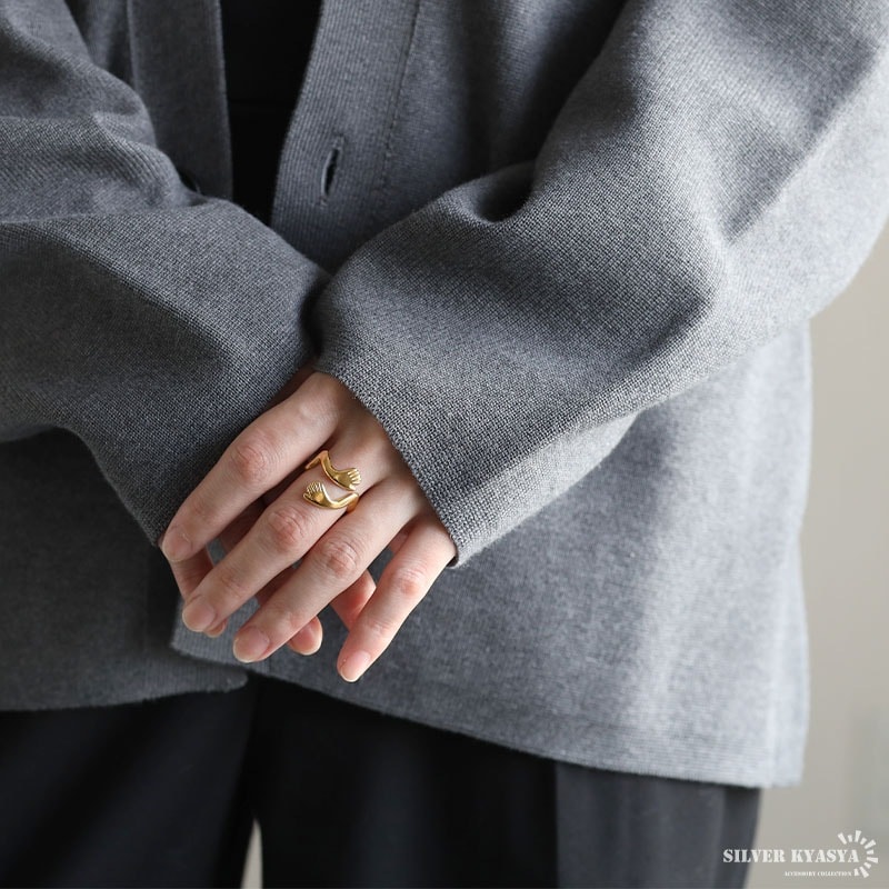 ■ITEM DETAIL ハグをイメージしたユニークなリング。両手で抱きしめるデザインが温かみと安らぎの雰囲気を纏います。個性的でアクセントに最適のアイテム。 ■ステンレス素材 金属部分は頑丈なことで知られるステンレス素材を採用。耐久性はもちろん耐水性も高く水場での着用も可能。金属アレルギーも出にくいとされている金属です。 | |